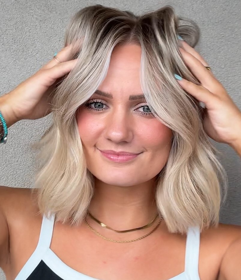 You can visually slim out your features by accentuating strands in the front. Besides, you can create loose waves to enhance the hair texture. This style looks fantastic on blonde hair with shadow roots.