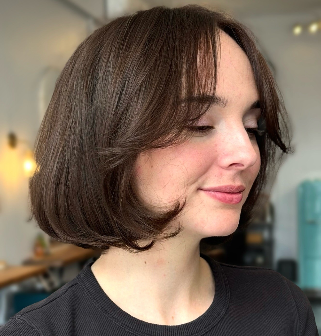 While a blunt haircut might not give your hair enough volume, a small trick can totally change the situation. Making the crop a bit angled towards the front and adding soft face-framing bangs visually reduces the flatness.