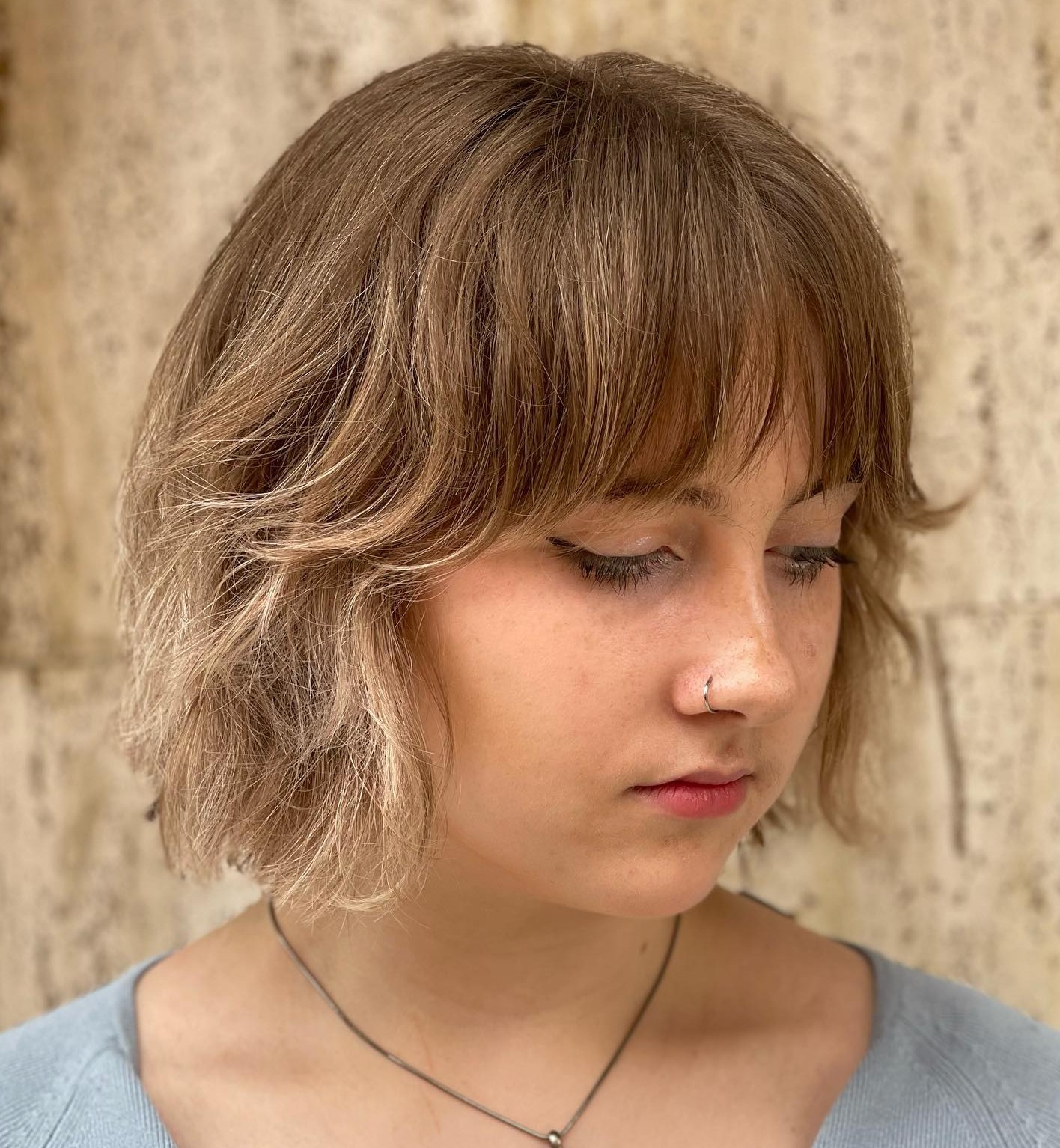 Choppy layers at the bottom of an otherwise uniform cut put a fun twist on a standard crop. An effortless look like this becomes easy to achieve. After washing the hair, let it dry and create a subtle wave at the tip that doesn’t appear too styled.