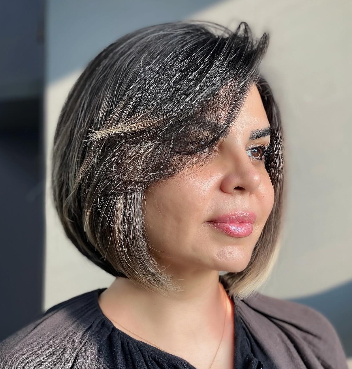 Bad hair days are finally over with this chin-length haircut and a deep side parting. Your hair will look more voluminous, and due to the asymmetry provided by the parting, help you draw the focus away from any imperfections. Not to mention that gray blending is simply gorgeous!