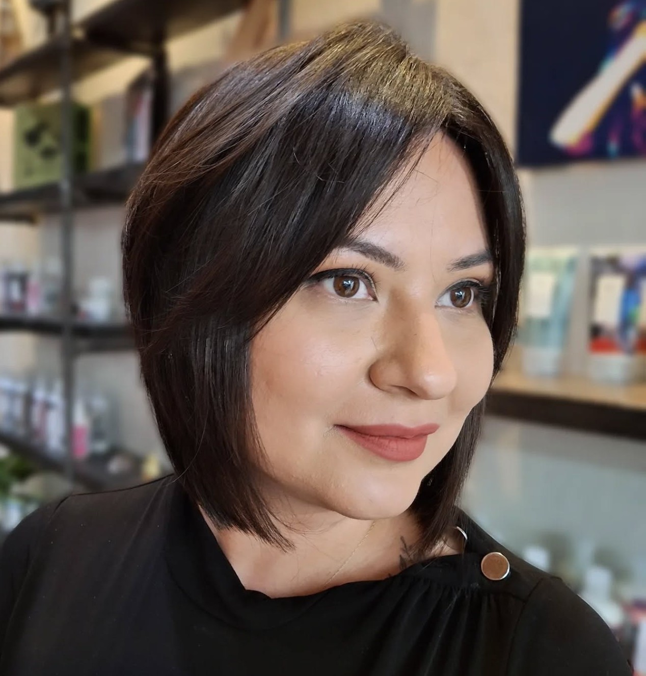 Without any doubt, a one-length cut with a slightly stacked nape is one of the most flattering shapes for a curved jawline. What is more, this hairstyle is incredibly versatile due to a wide choice of color options and partings – middle, side, irregular – you choose it!