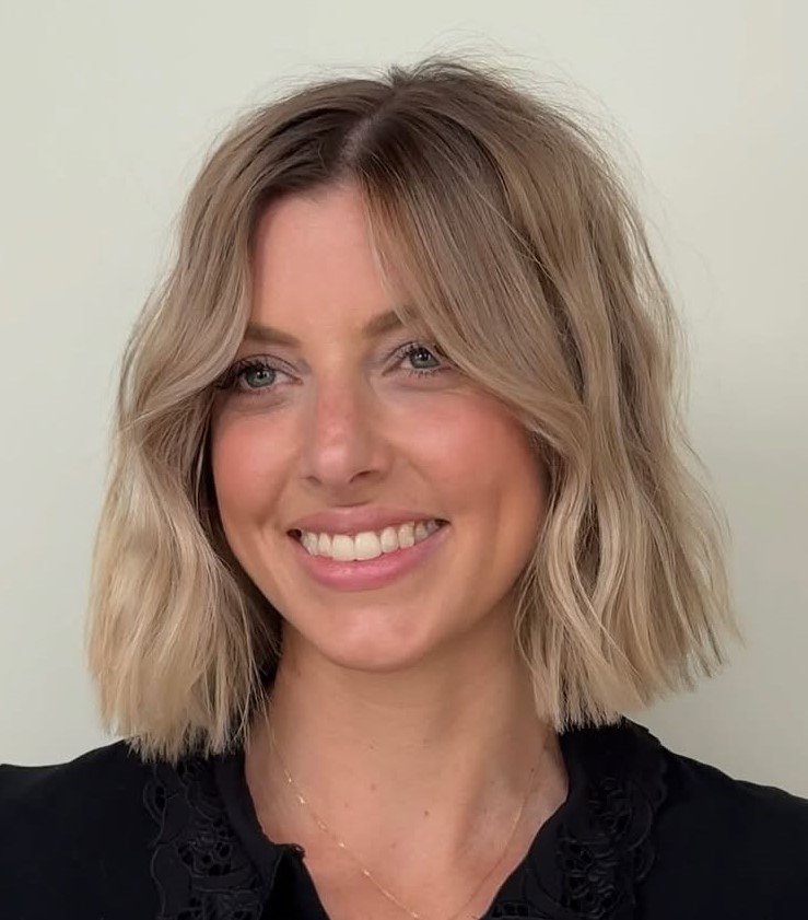 This honey bronde hair hue achieves a gentle and uncontrived aesthetic that harmonizes beautifully with neutral skin tones. If your hair is of medium to long length, initiate the process of crafting those naturally flowing beach waves as Erin Ray did here for a laid-back and relaxed appearance.