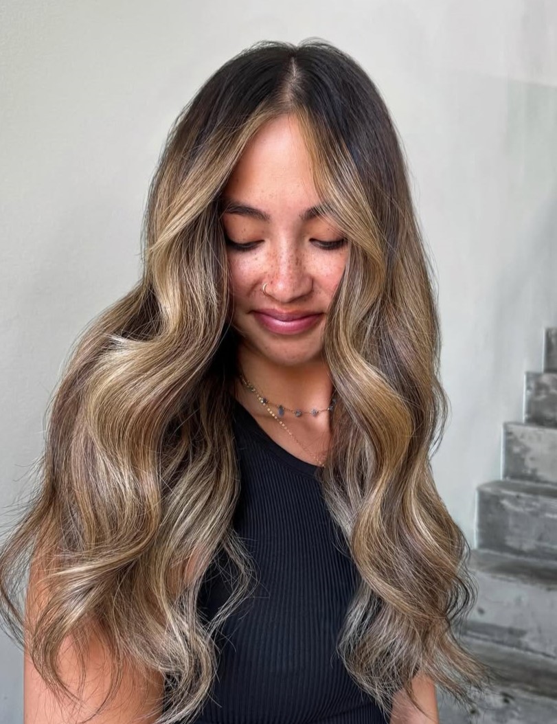 This stunning look starts with a rich dark chocolate base and gradually transitions into an ash-blonde hue, creating a beautiful example of brown hair with highlights. With hair as luxuriously long as mermaid-like tresses, you can achieve a multi-dimensional transformation — just like Melissa Maloney did with a captivating style.