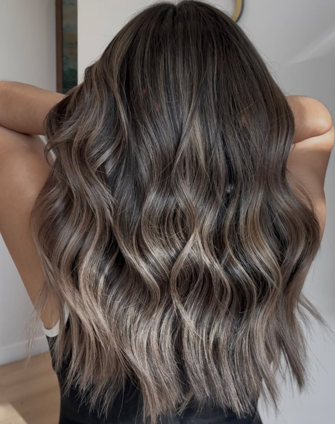 This stunning look starts with a rich dark chocolate base and gradually transitions into an ash-blonde hue, creating a beautiful example of brown hair with highlights. With hair as luxuriously long as mermaid-like tresses, you can achieve a multi-dimensional transformation — just like Melissa Maloney did with a captivating style.