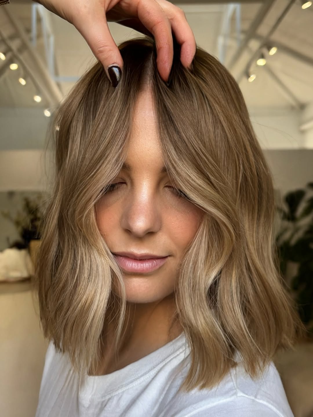 Bronde hair is a great way to add a touch of sophistication to your fine, layered hair. Tori Jennings, a hairstylist from PÈLO and the creator of this style, added lowlights to create dimension, variation and contrast. The middle part is also a clever styling choice that can draw attention to the face and create a balanced look.