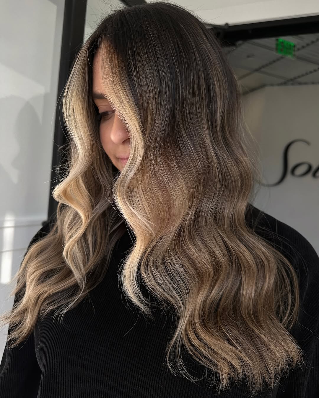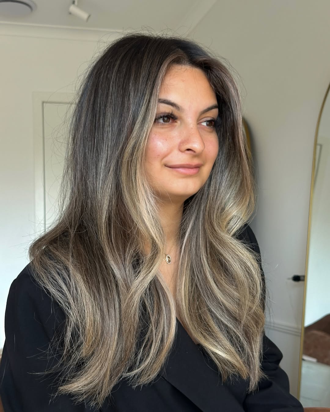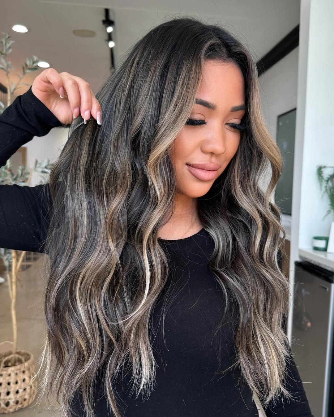 This stunning look starts with a rich dark chocolate base and gradually transitions into an ash-blonde hue, creating a beautiful example of brown hair with highlights. With hair as luxuriously long as mermaid-like tresses, you can achieve a multi-dimensional transformation — just like Melissa Maloney did with a captivating style.