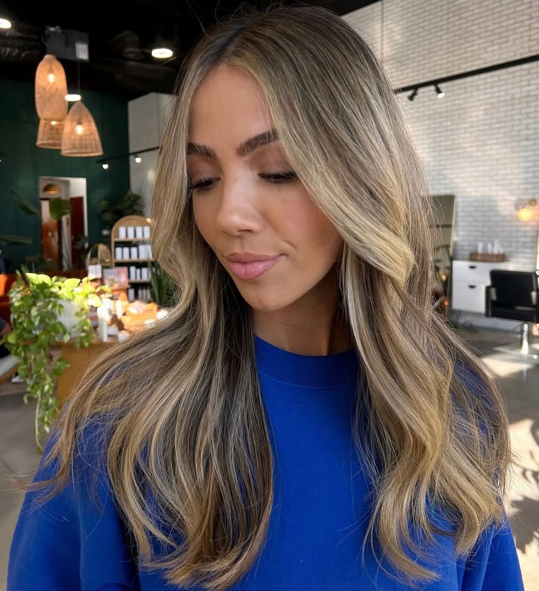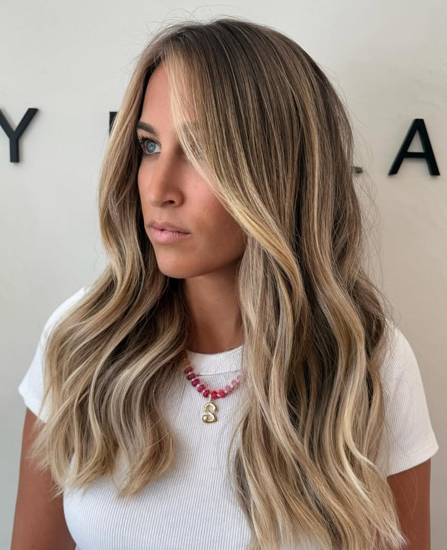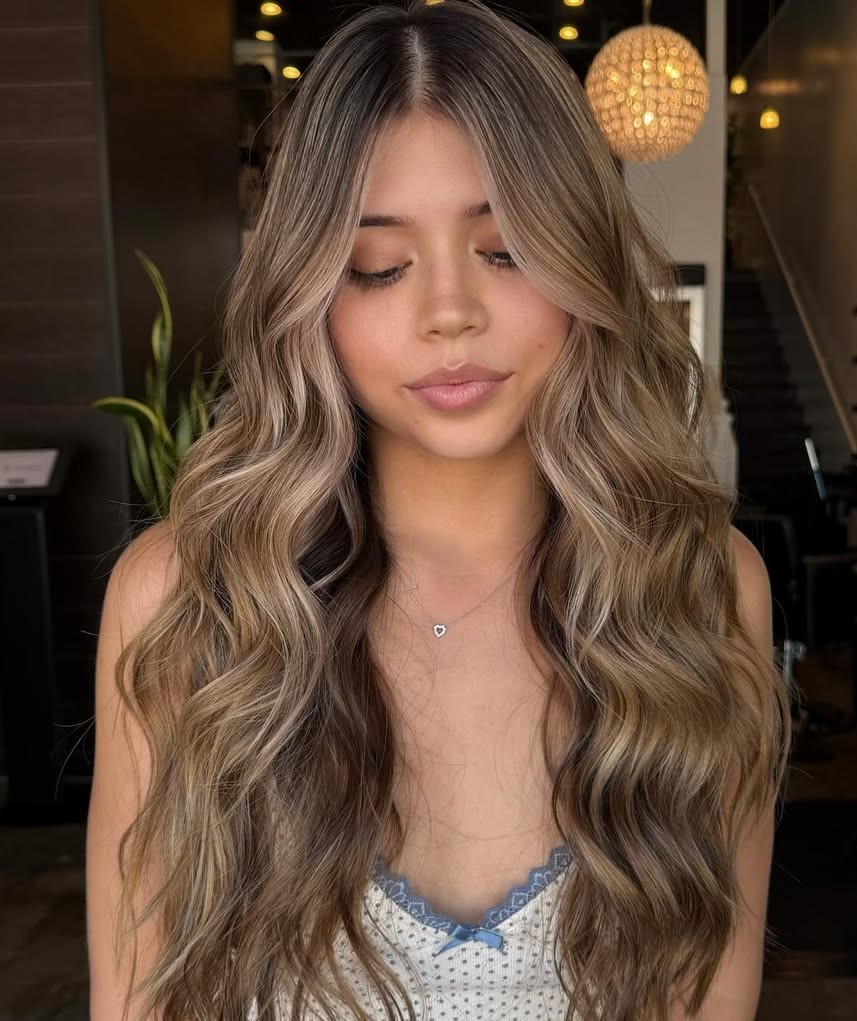 This stunning look starts with a rich dark chocolate base and gradually transitions into an ash-blonde hue, creating a beautiful example of brown hair with highlights. With hair as luxuriously long as mermaid-like tresses, you can achieve a multi-dimensional transformation — just like Melissa Maloney did with a captivating style.