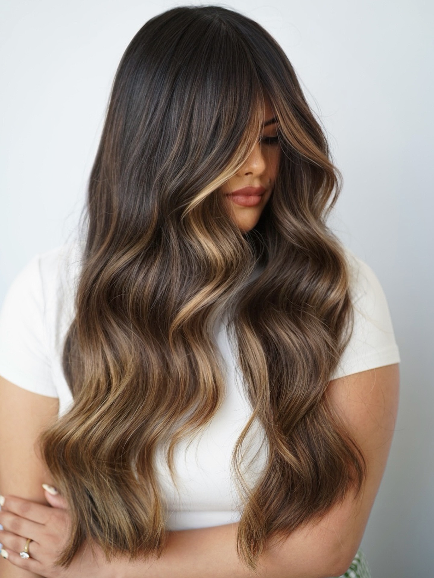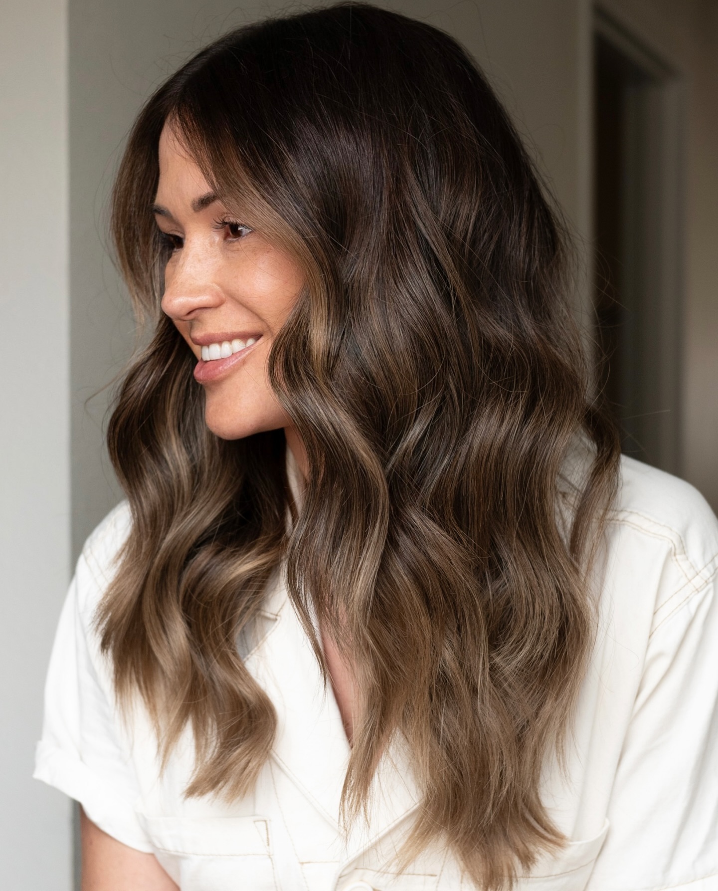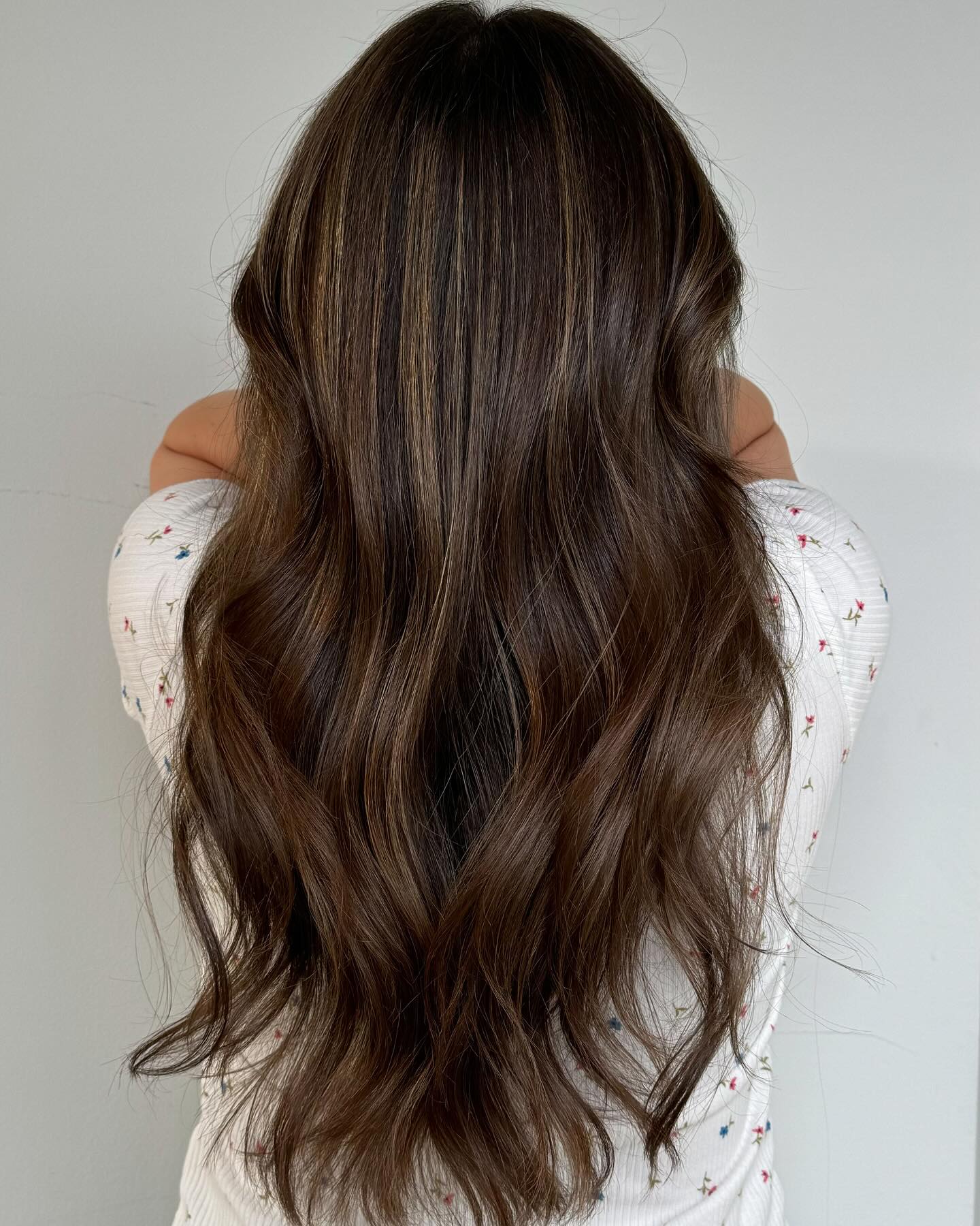 The color transition doesn’t have to be dramatic to make an impact. Dark brown hair with highlights, such as soft, milk chocolate tones on the ends and around the face, offers a subtle yet beautiful lift. If you have shoulder-length locks, style them in loose, messy waves for a modern and feminine finish.
