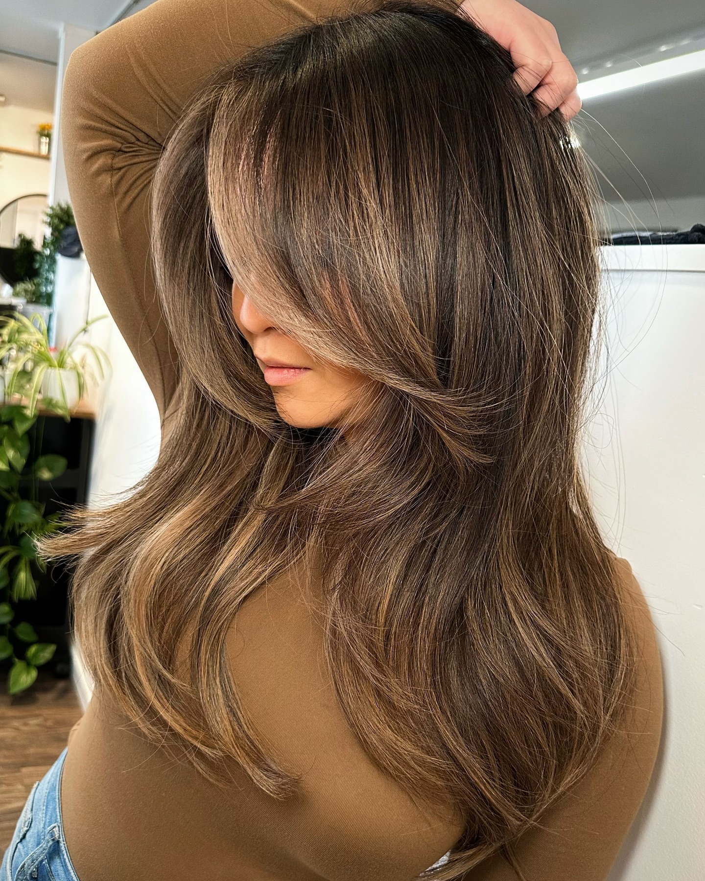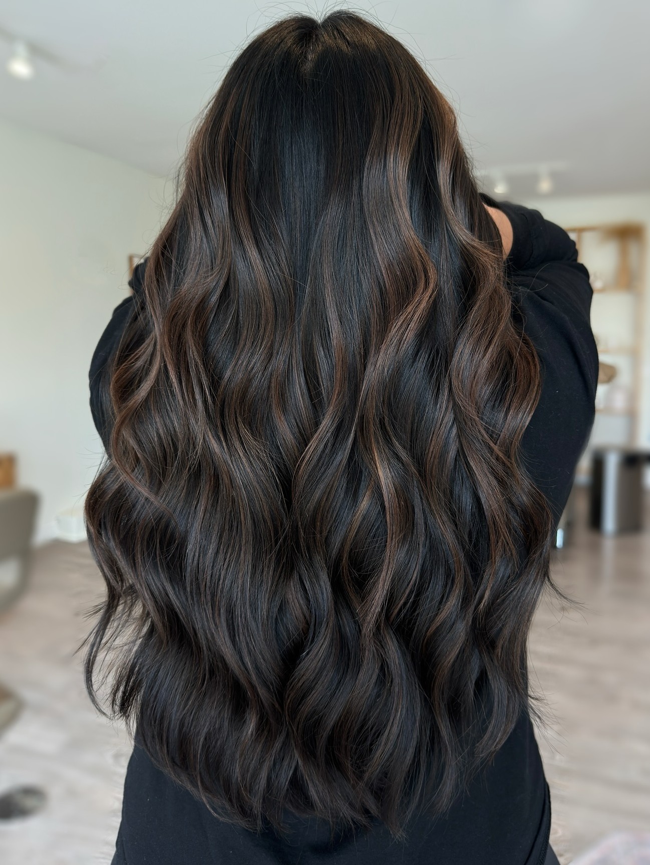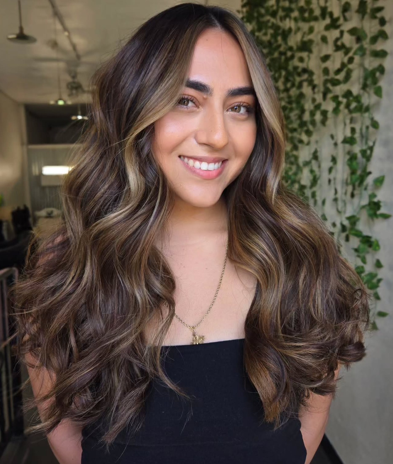 The color transition doesn’t have to be dramatic to make an impact. Dark brown hair with highlights, such as soft, milk chocolate tones on the ends and around the face, offers a subtle yet beautiful lift. If you have shoulder-length locks, style them in loose, messy waves for a modern and feminine finish.
