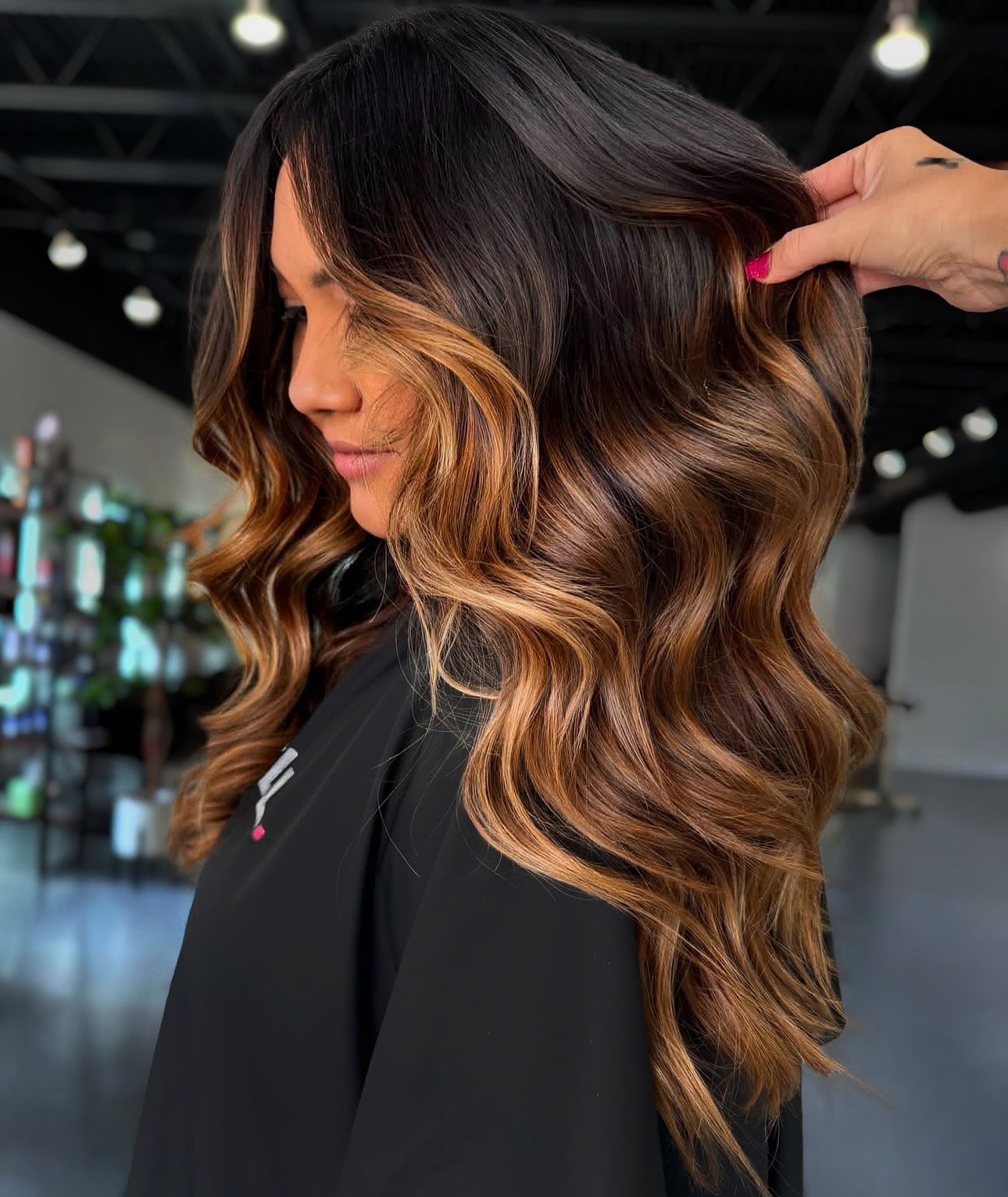 The color transition doesn’t have to be dramatic to make an impact. Dark brown hair with highlights, such as soft, milk chocolate tones on the ends and around the face, offers a subtle yet beautiful lift. If you have shoulder-length locks, style them in loose, messy waves for a modern and feminine finish.