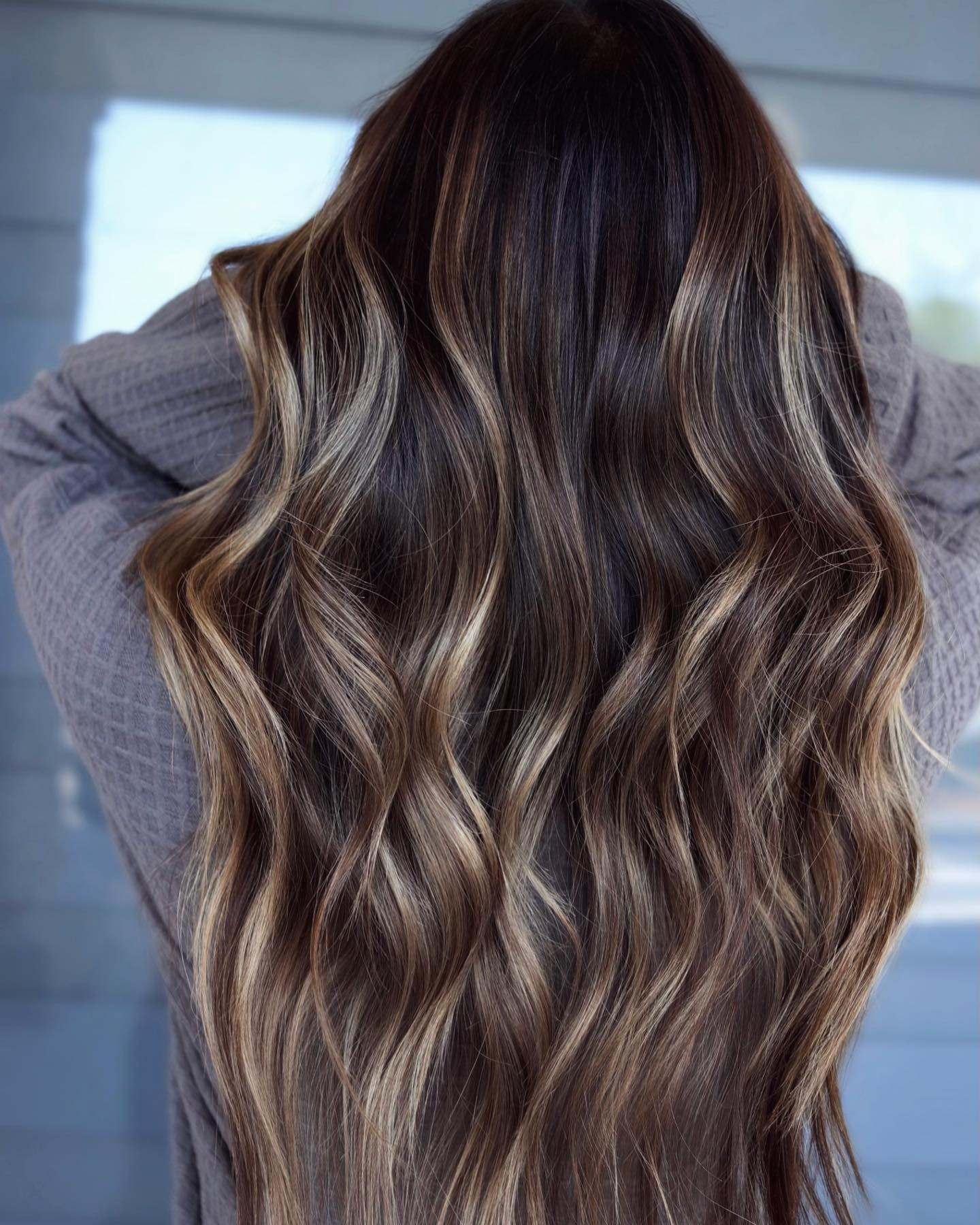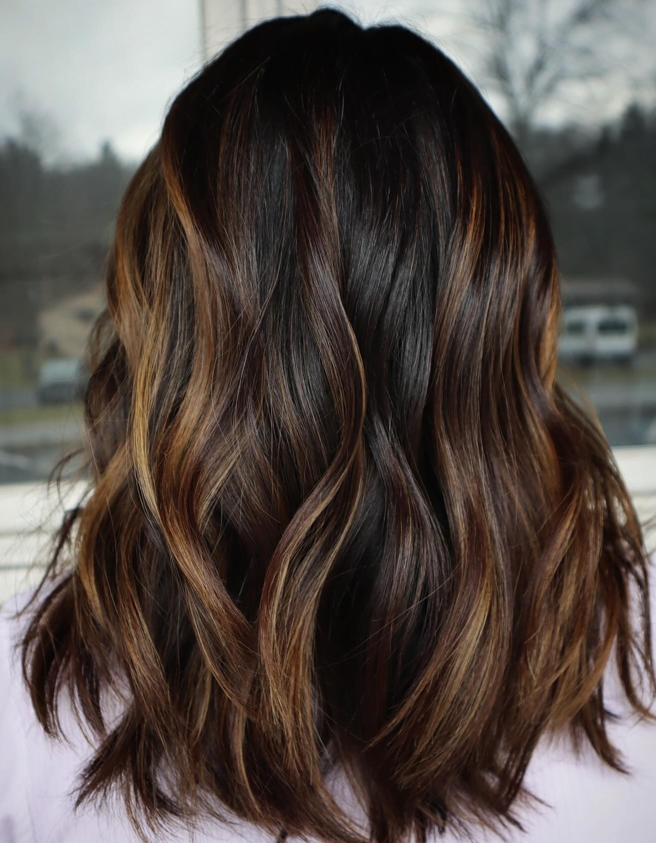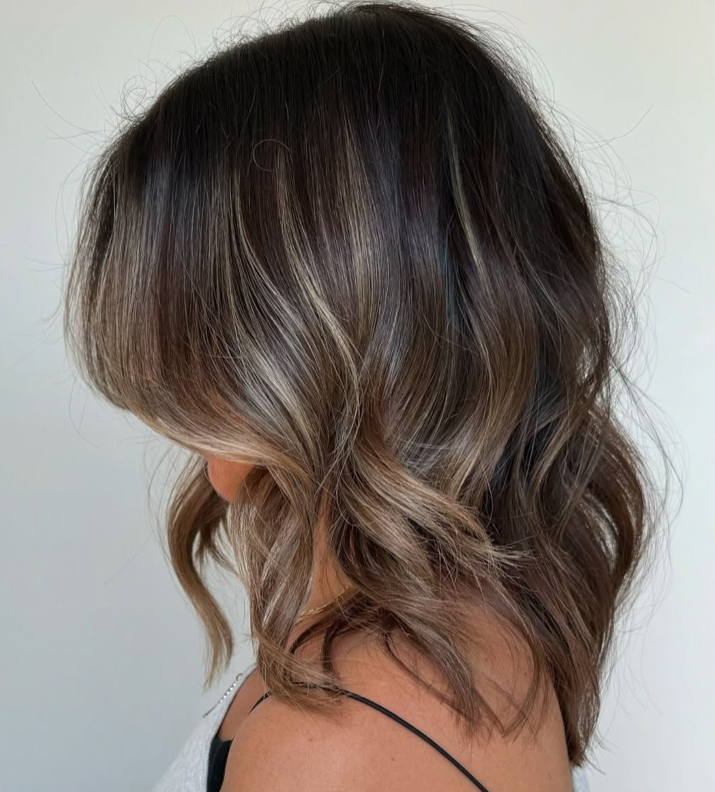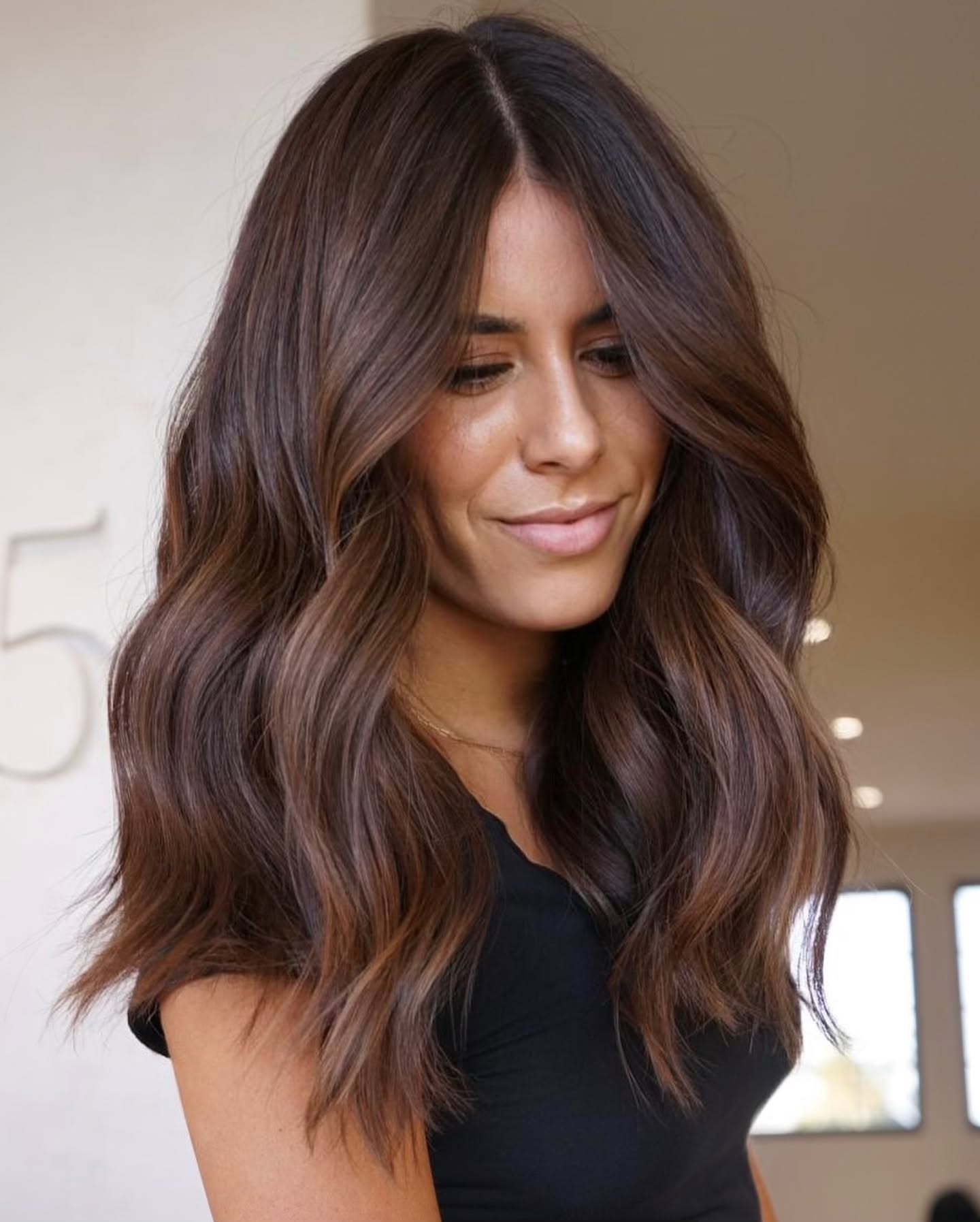 The color transition doesn’t have to be dramatic to make an impact. Dark brown hair with highlights, such as soft, milk chocolate tones on the ends and around the face, offers a subtle yet beautiful lift. If you have shoulder-length locks, style them in loose, messy waves for a modern and feminine finish.