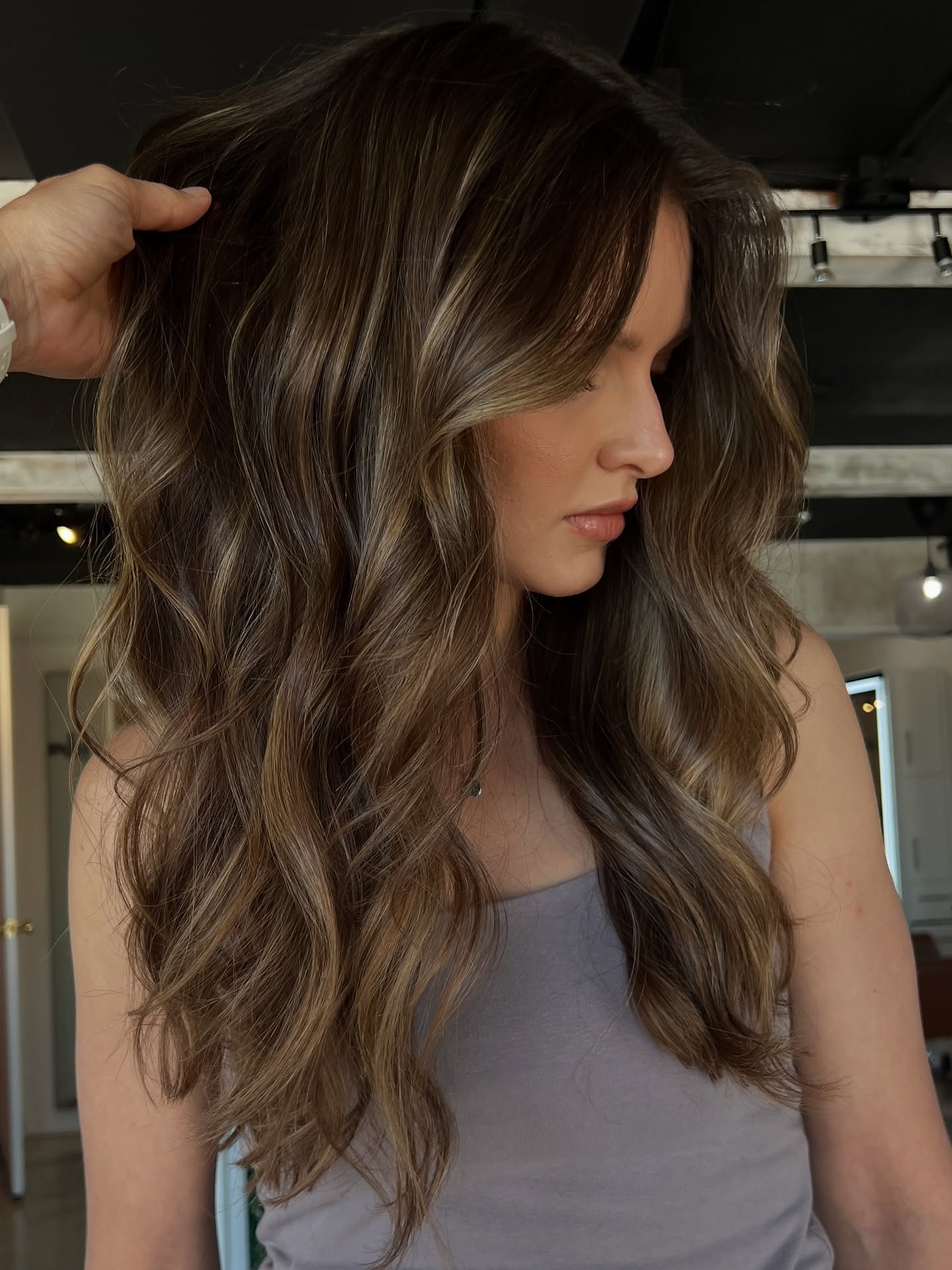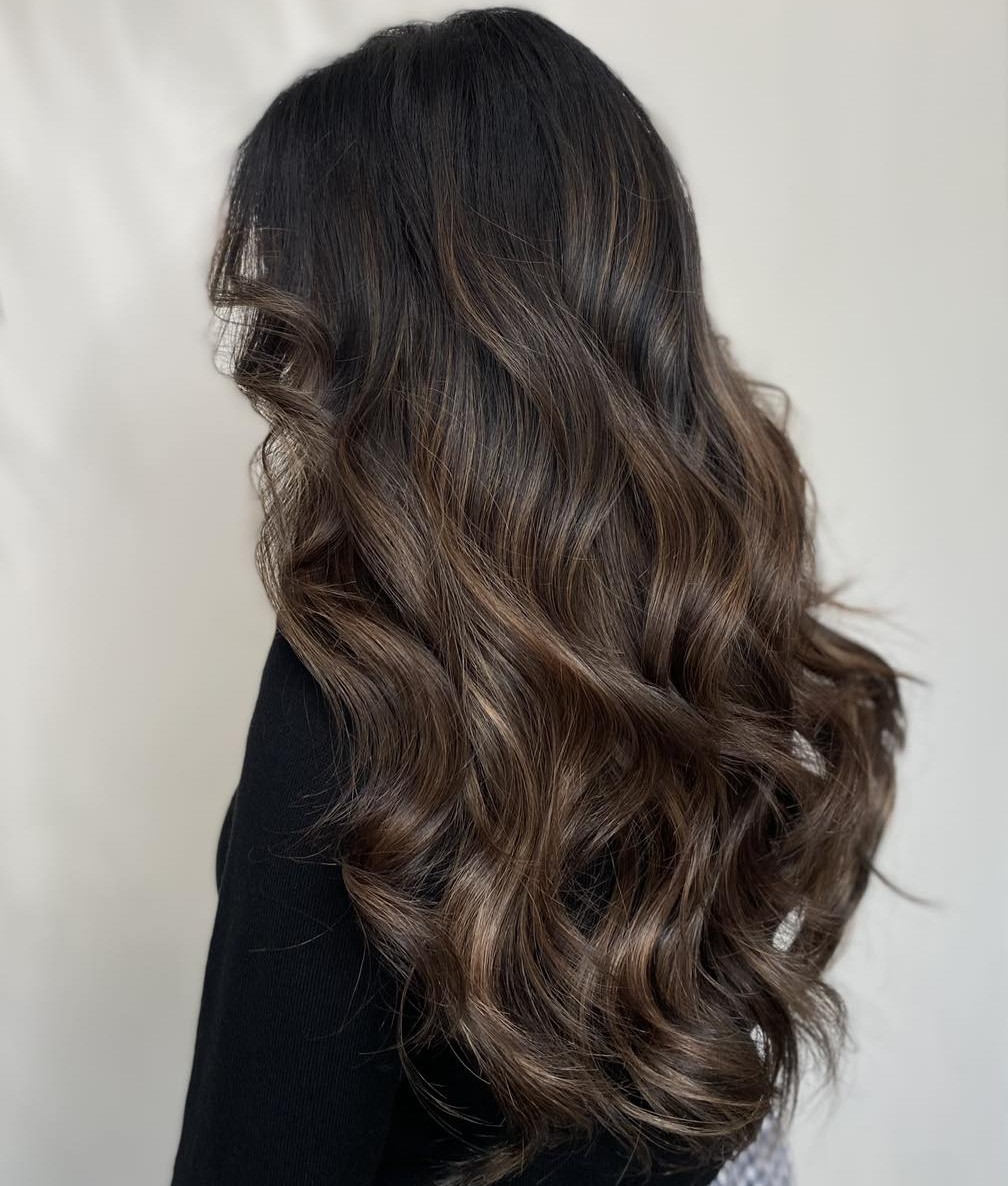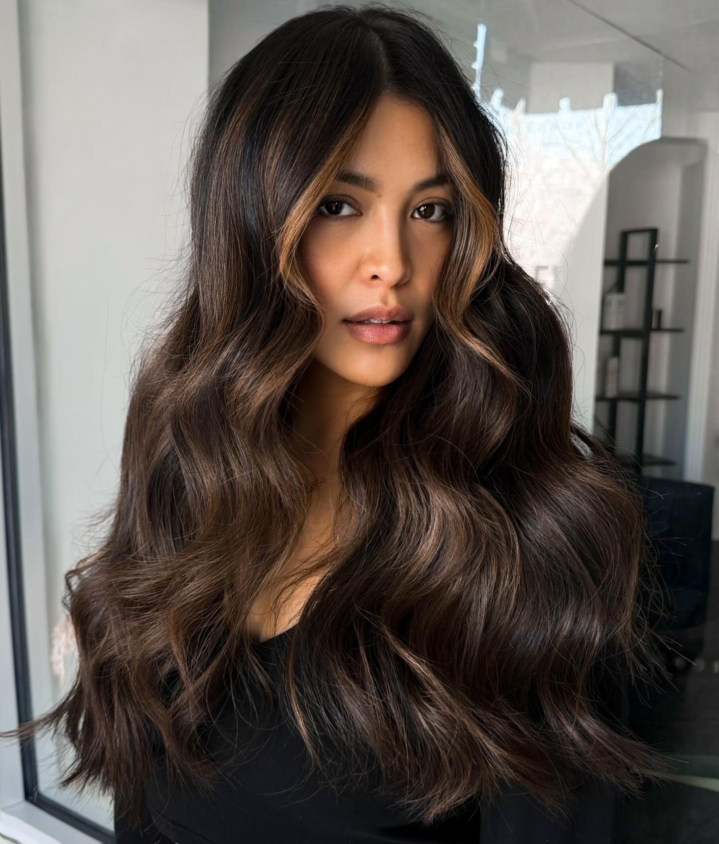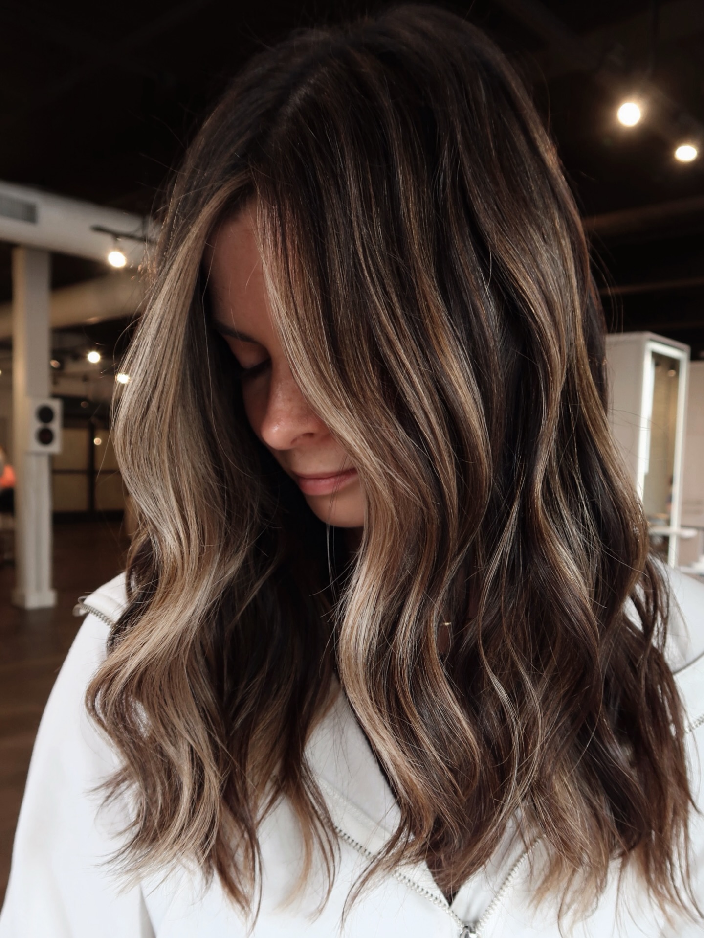 The color transition doesn’t have to be dramatic to make an impact. Dark brown hair with highlights, such as soft, milk chocolate tones on the ends and around the face, offers a subtle yet beautiful lift. If you have shoulder-length locks, style them in loose, messy waves for a modern and feminine finish.