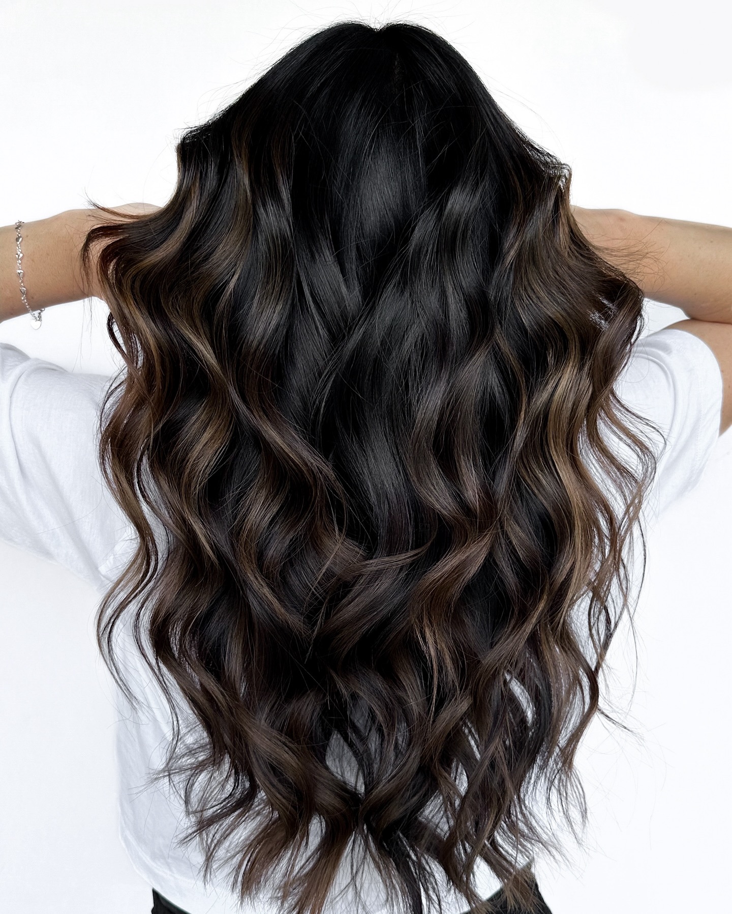 Warm highlights are an overwhelmingly popular option; however, if you choose cool shades, they will intensify the inner glow of your naturally dark hair. For better results, curl your locks and apply some texturizing spray.