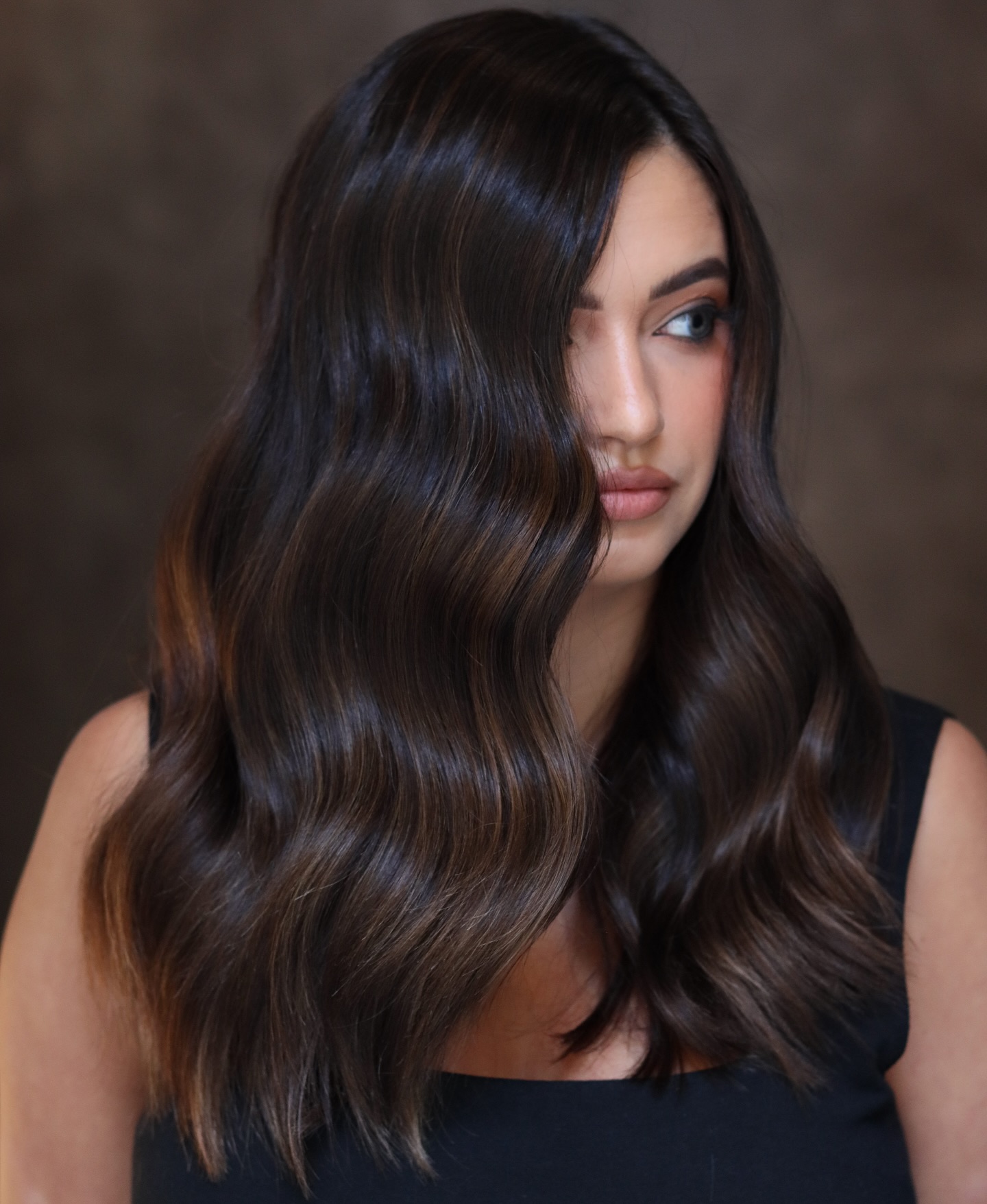 Naturally dark tones pair exceptionally well with rich chocolate brown hair. Add some full-bodied curls or beach waves for a chic look and feel. Going just a shade or two lighter than your natural color offers much impact without a drastic change.