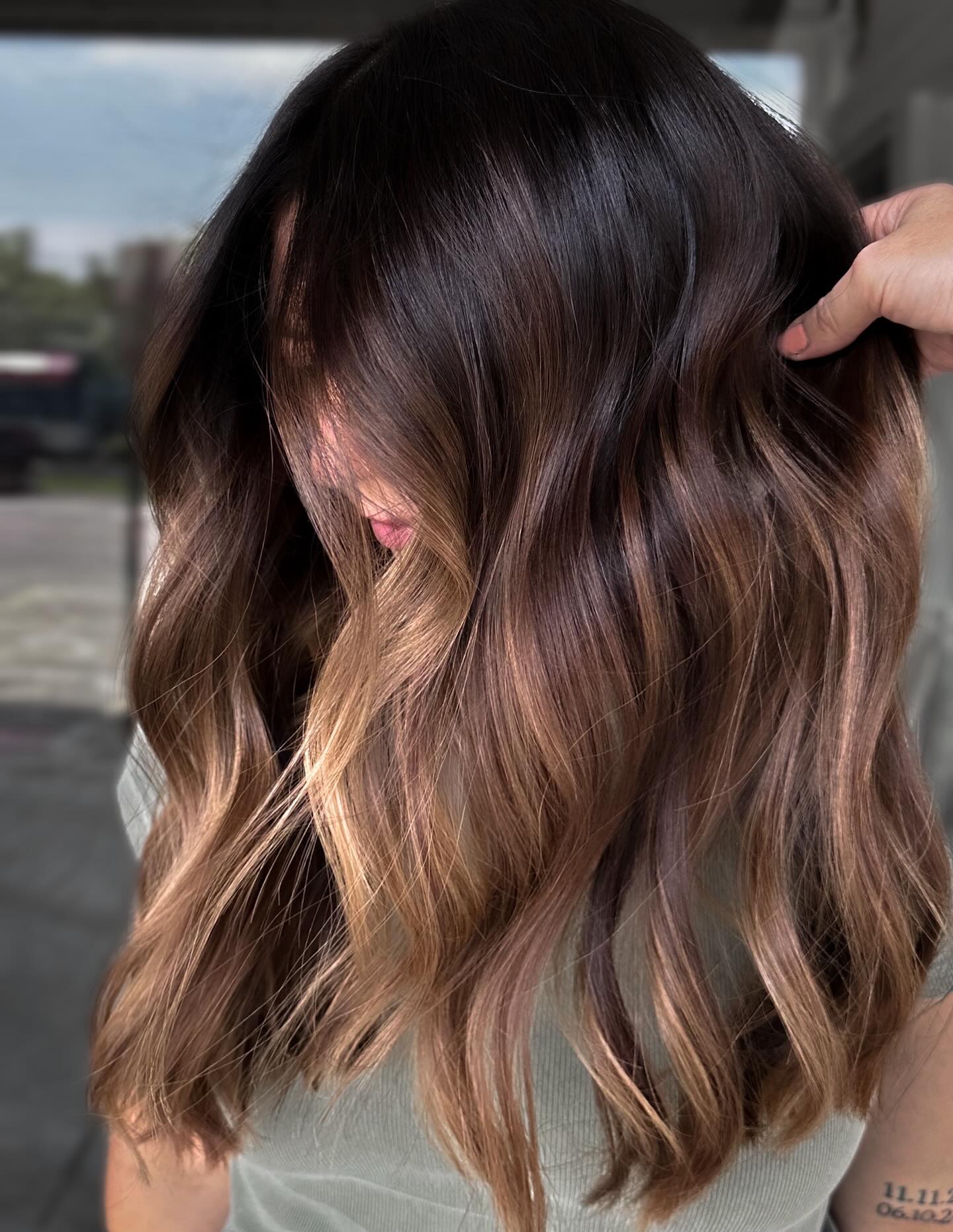 A caramel blend is perfect for dark brown hair of any length. Pair this light, warm shade with layered locks or waves to deliver more volume and movement to your mane.