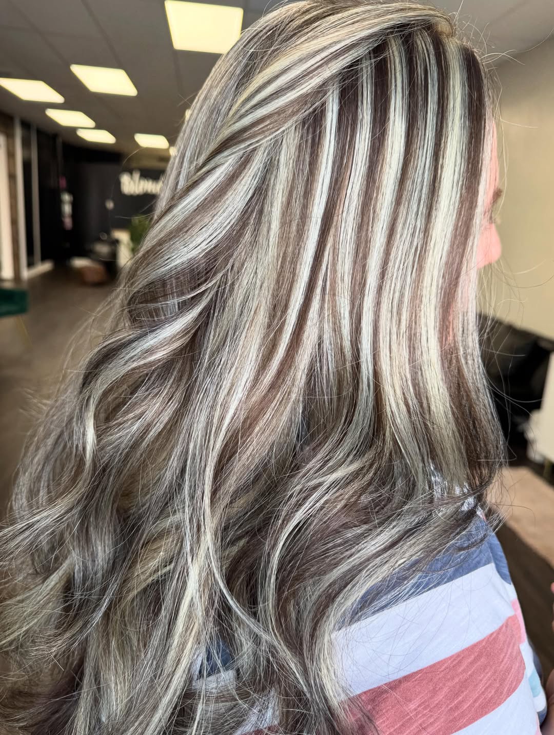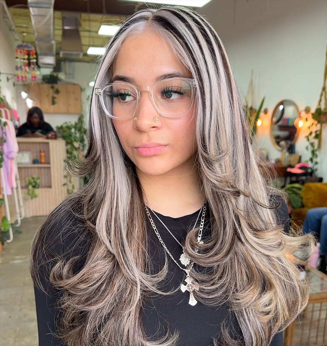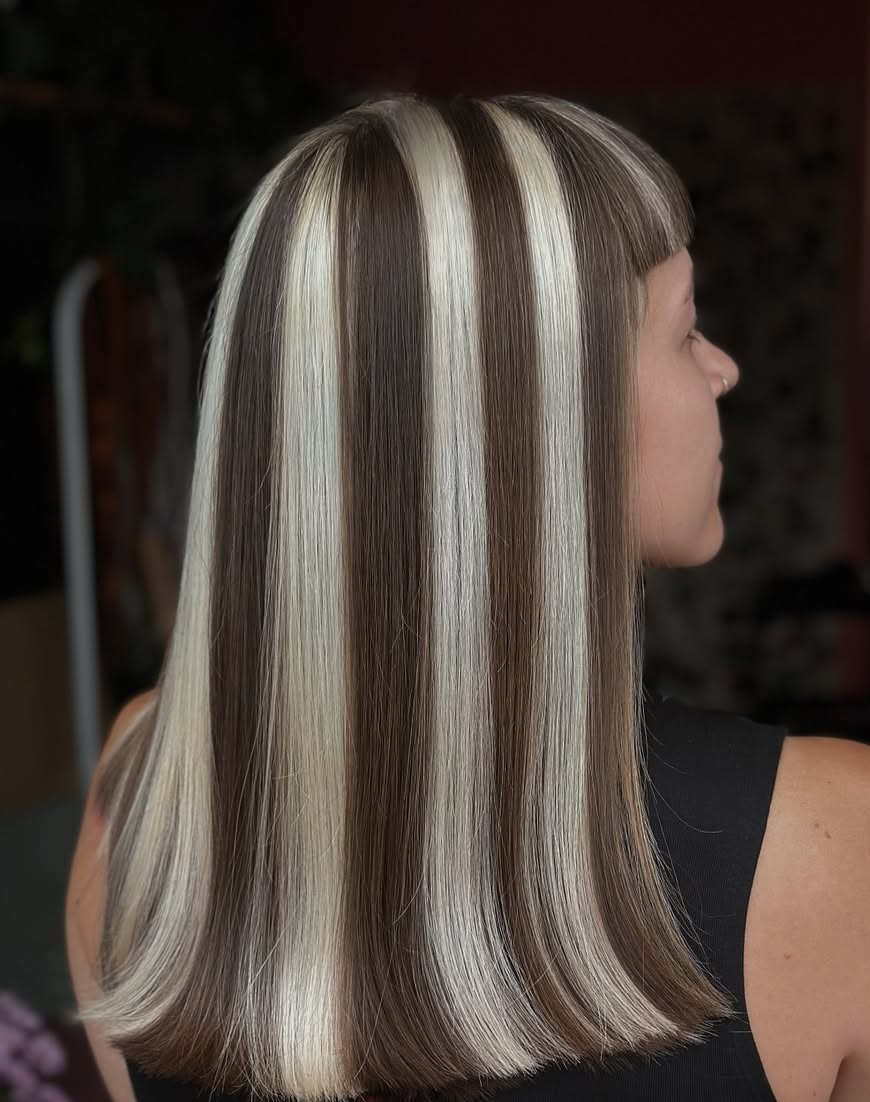 Chunky highlights are the favorite trend of all celebrities who keep up with the latest fashions. The 2025 version is more of face-framing ribbon highlights that continue throughout the strands. However, some bolder options like skunk stripes and zebra-looking patterns are also in trend.