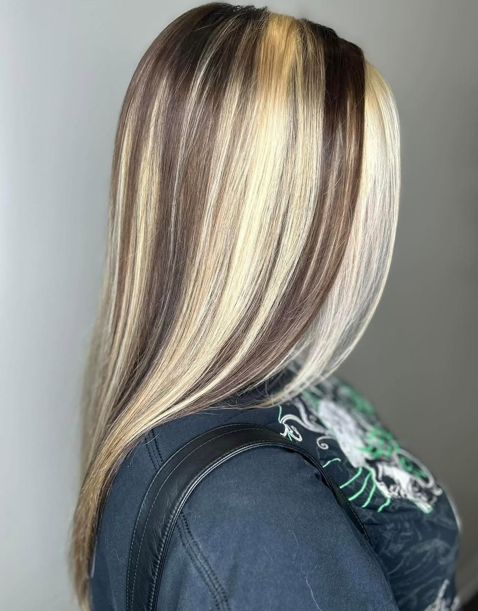 This highly defined color is an excellent solution for girls who dream of something more than a simple classic balayage. Starting from the roots, these blonde ribbons create much contrast with the brown base color, thus defining and shaping the hairstyle.