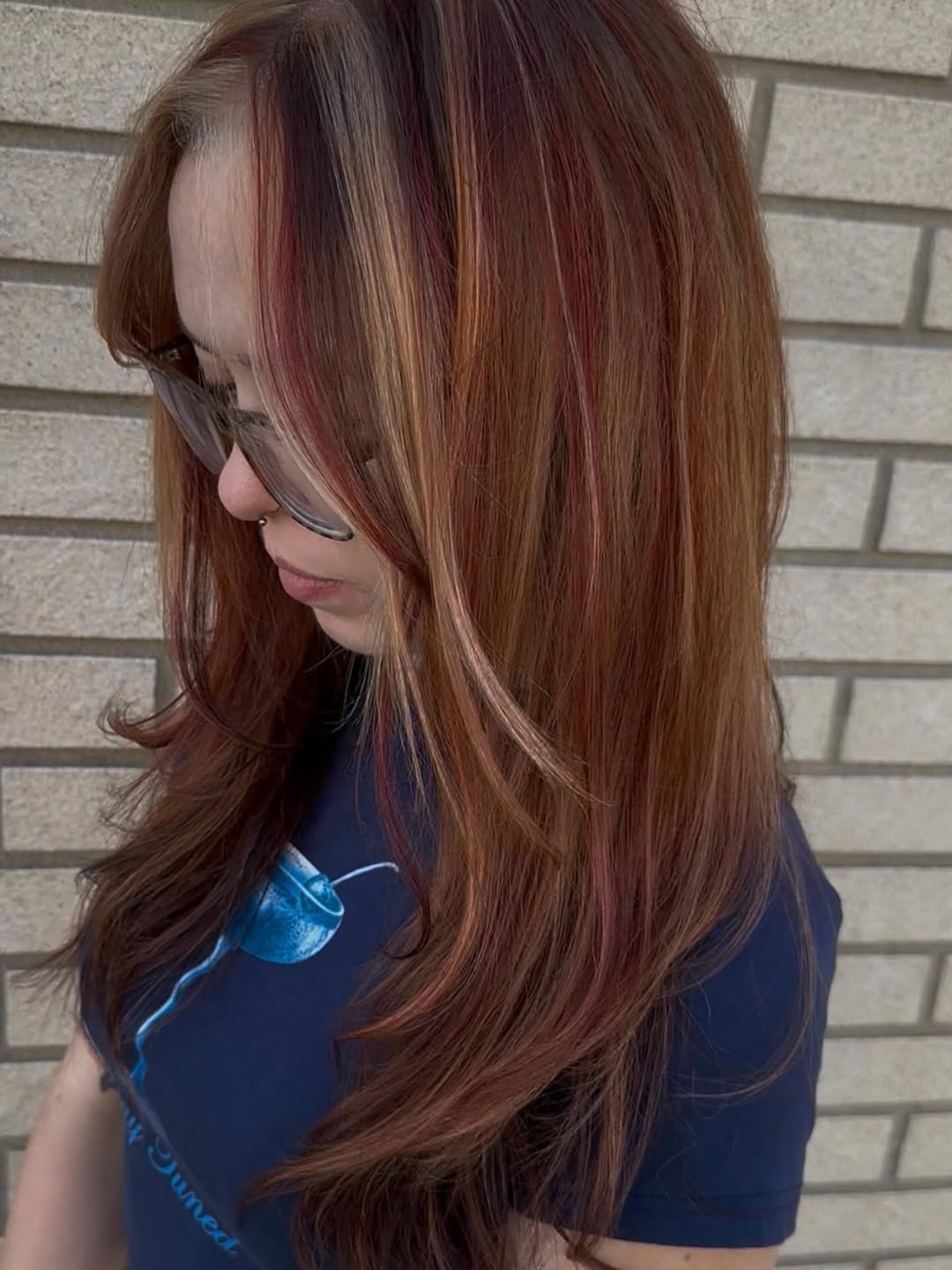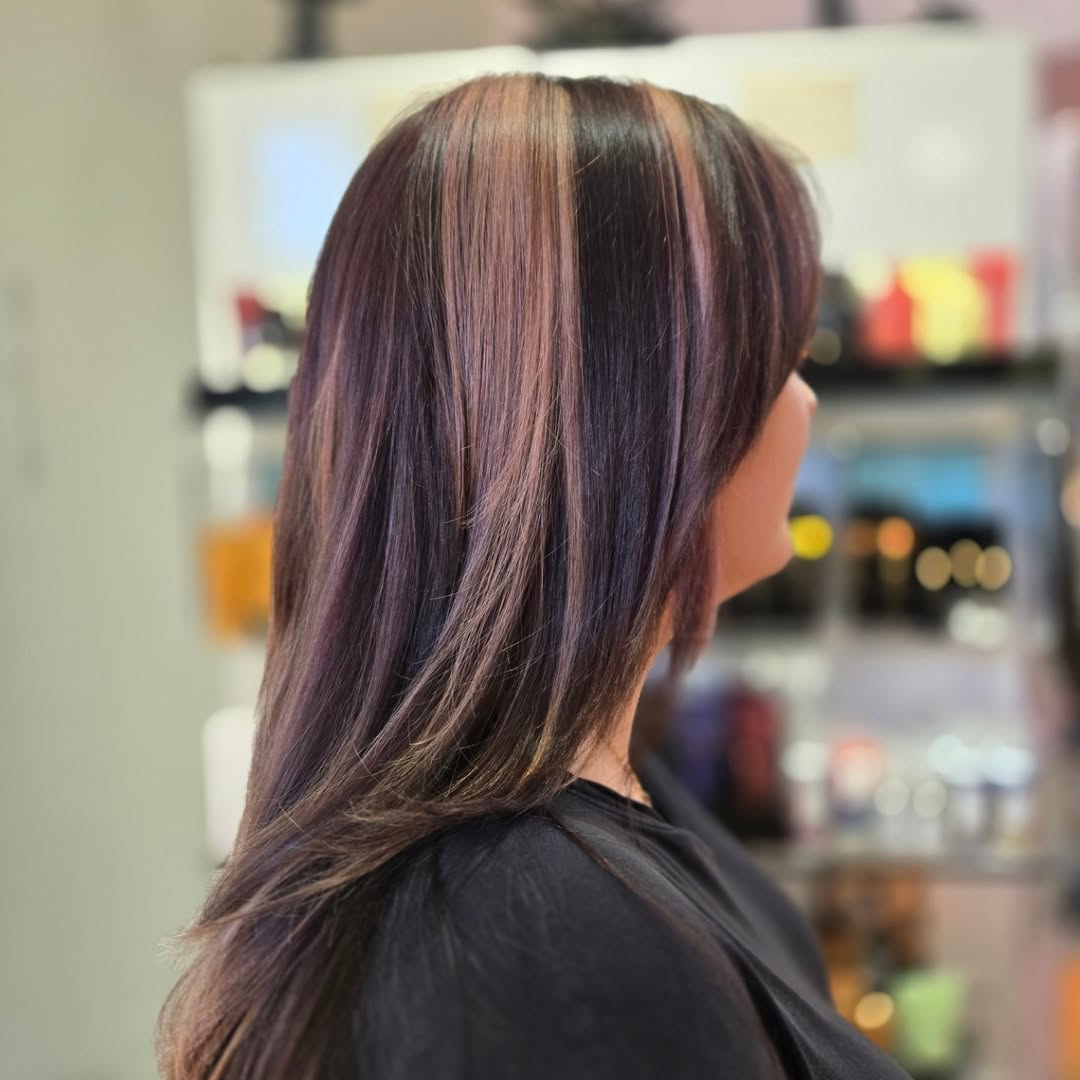Amplify the charm of your long, volumoius blowout with a striking play of contrasts. Introduce captivating copper highlights to your dark brown hair, creating a dynamic movement that’s sure to turn heads.