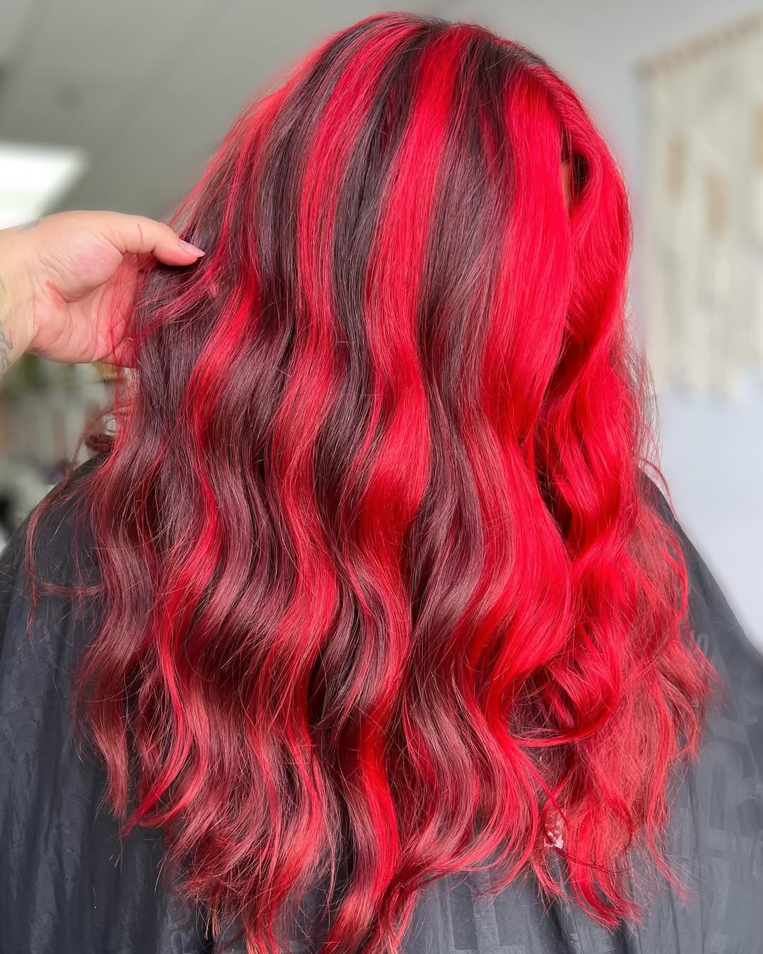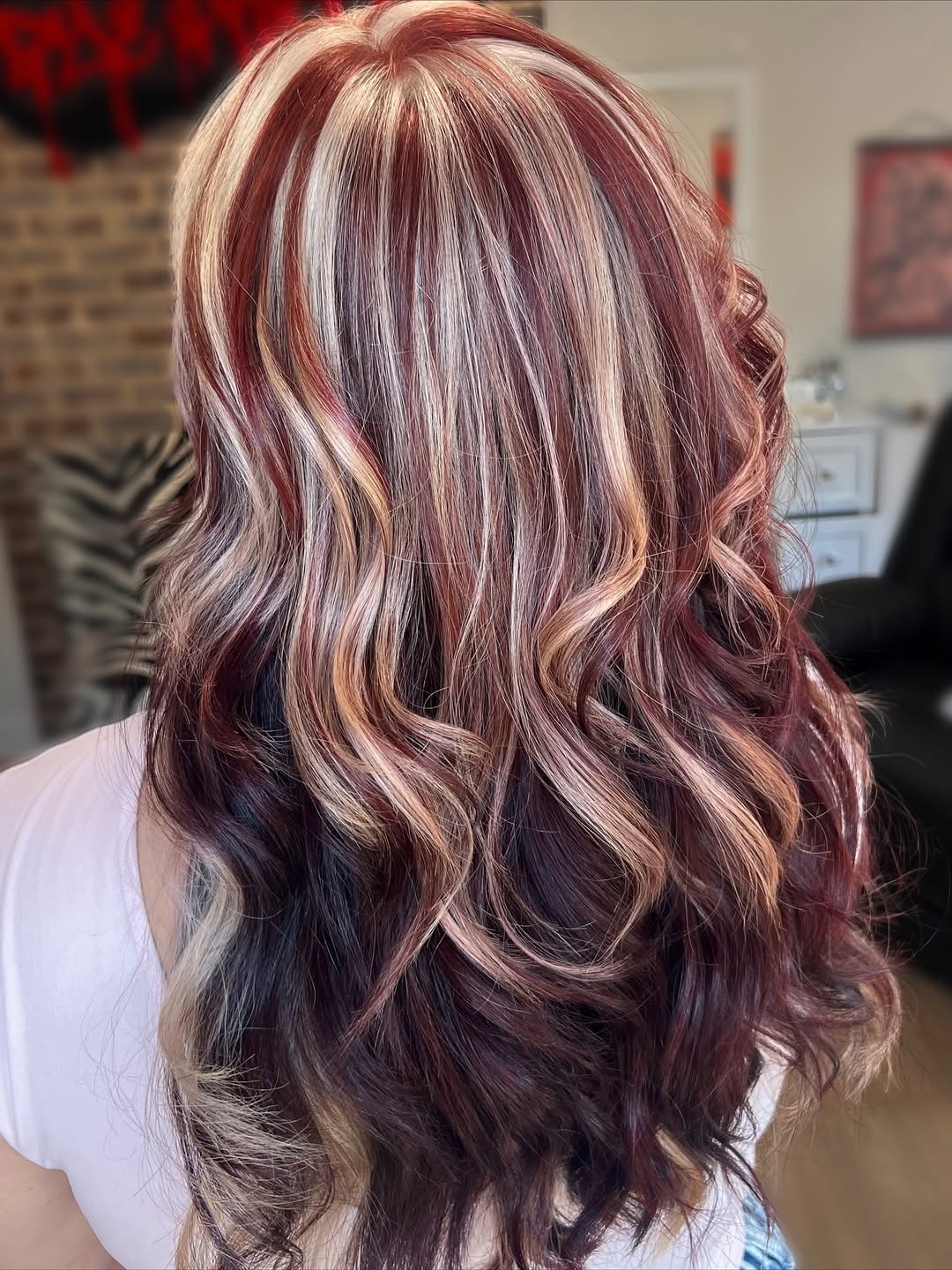 Black hair is a perfect canvas to contrast vibrant plumy red shades. Alternate thick highlights with babylights to add extra depth and some definition to the color. Style it big and wavy for a fiery finish!
