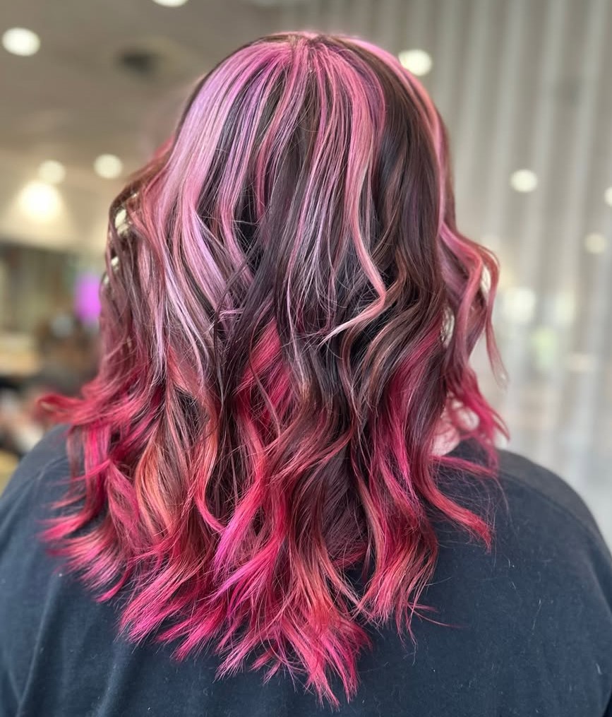 Do you remember the iconic hairstyle Kelly Clarkson wore back in the ’90s? This style is a modern version of the popular trend. Enhance your distinct blonde panels with an ashy and pastel pink gradient toner, to emphasize your look and make it very personalized.