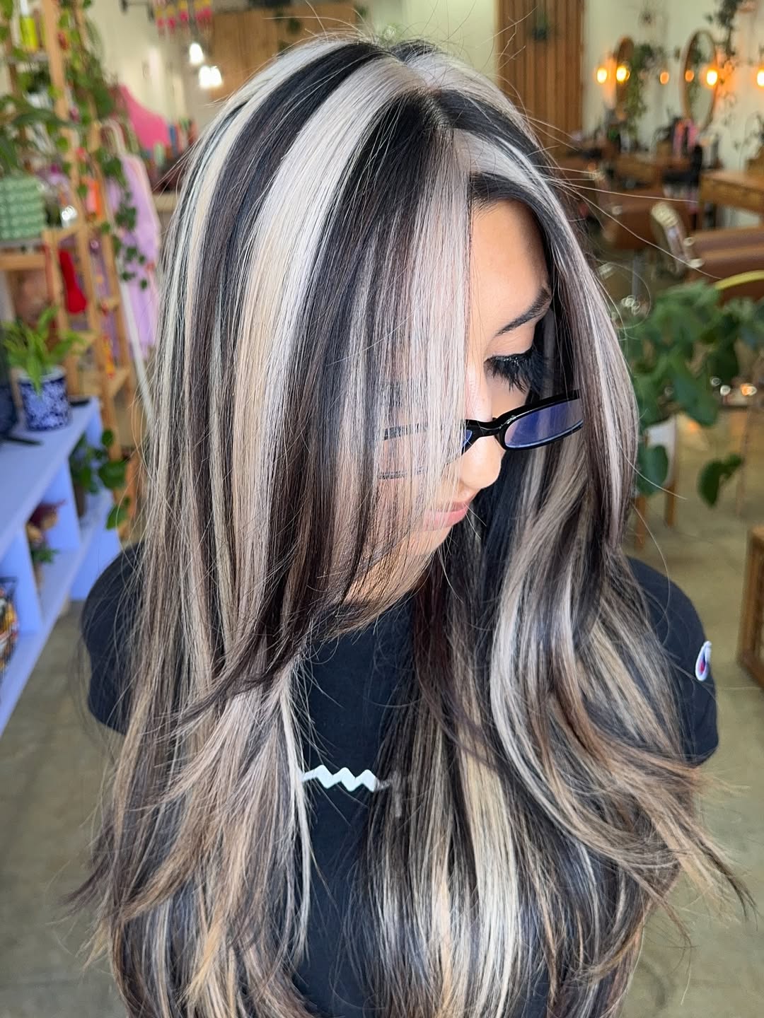 For those who want to take a bolder approach to the trend, this platinum blonde ribbon highlight on black hair is just what you need. Paired with funky ‘do, this hue looks truly stylish and unique.