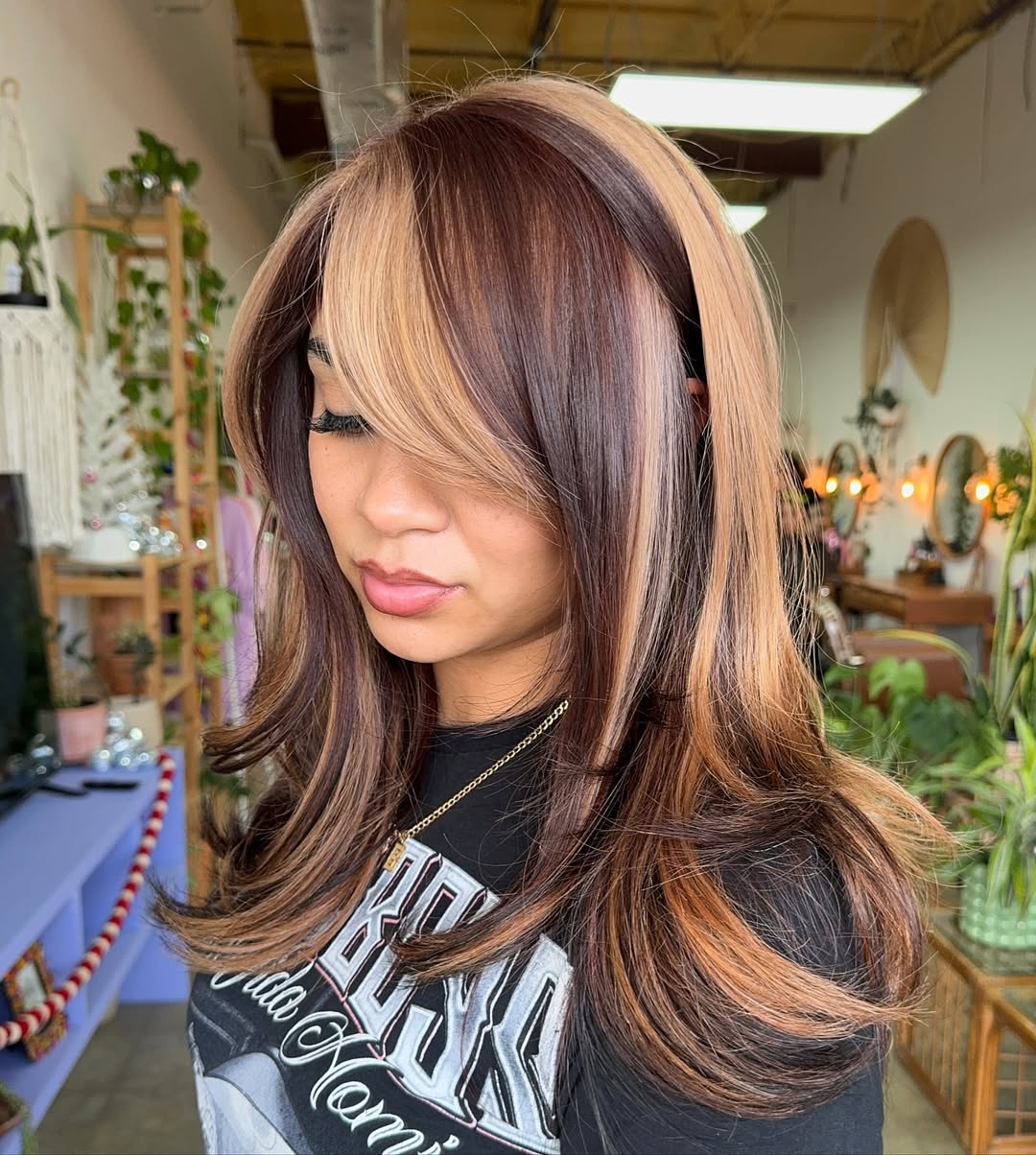 If you feel your hairstyle lacks that wow factor, consider adding a large money piece to the front of your hairtyle. Coloring this statement-making ribbon in a completely different hue creates a striking accent that beautifully contrasts with the rest of your hair.