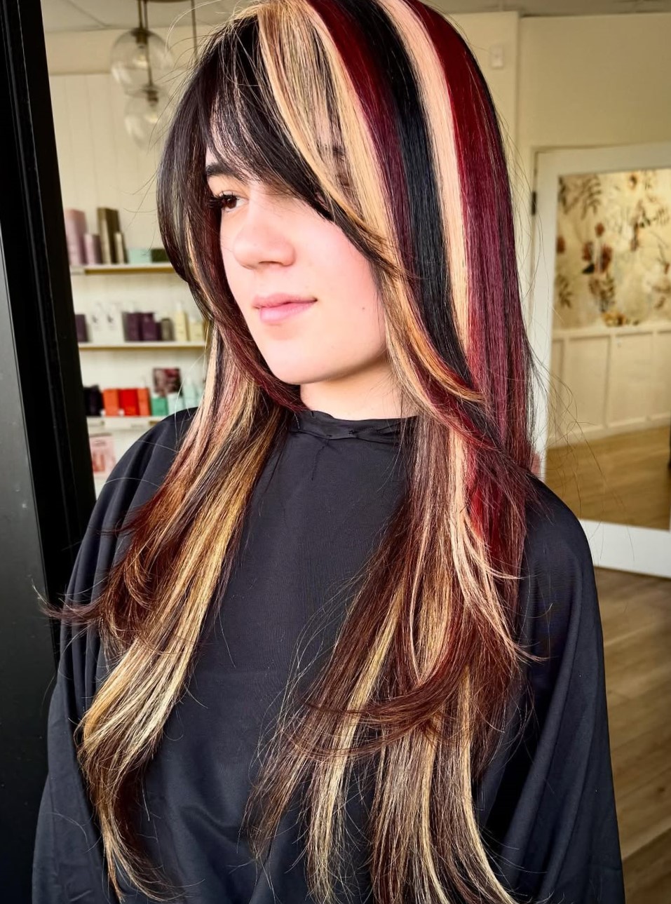 Chunky highlights are the favorite trend of all celebrities who keep up with the latest fashions. The 2025 version is more of face-framing ribbon highlights that continue throughout the strands. However, some bolder options like skunk stripes and zebra-looking patterns are also in trend.