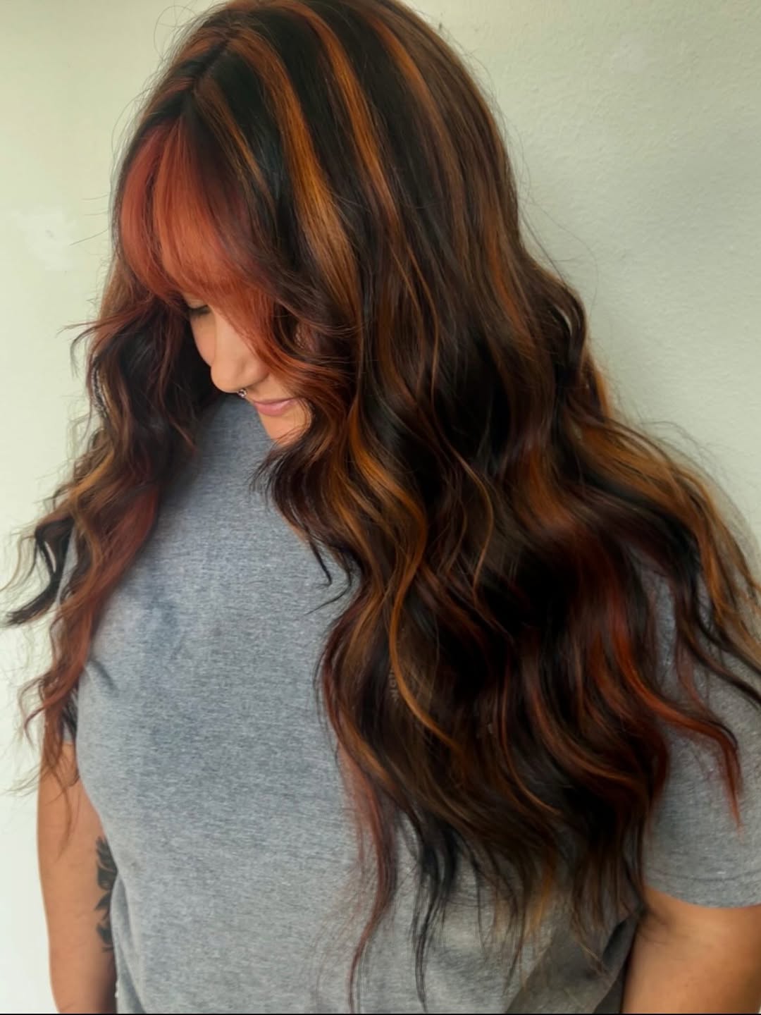Amplify the charm of your long, volumoius blowout with a striking play of contrasts. Introduce captivating copper highlights to your dark brown hair, creating a dynamic movement that’s sure to turn heads.