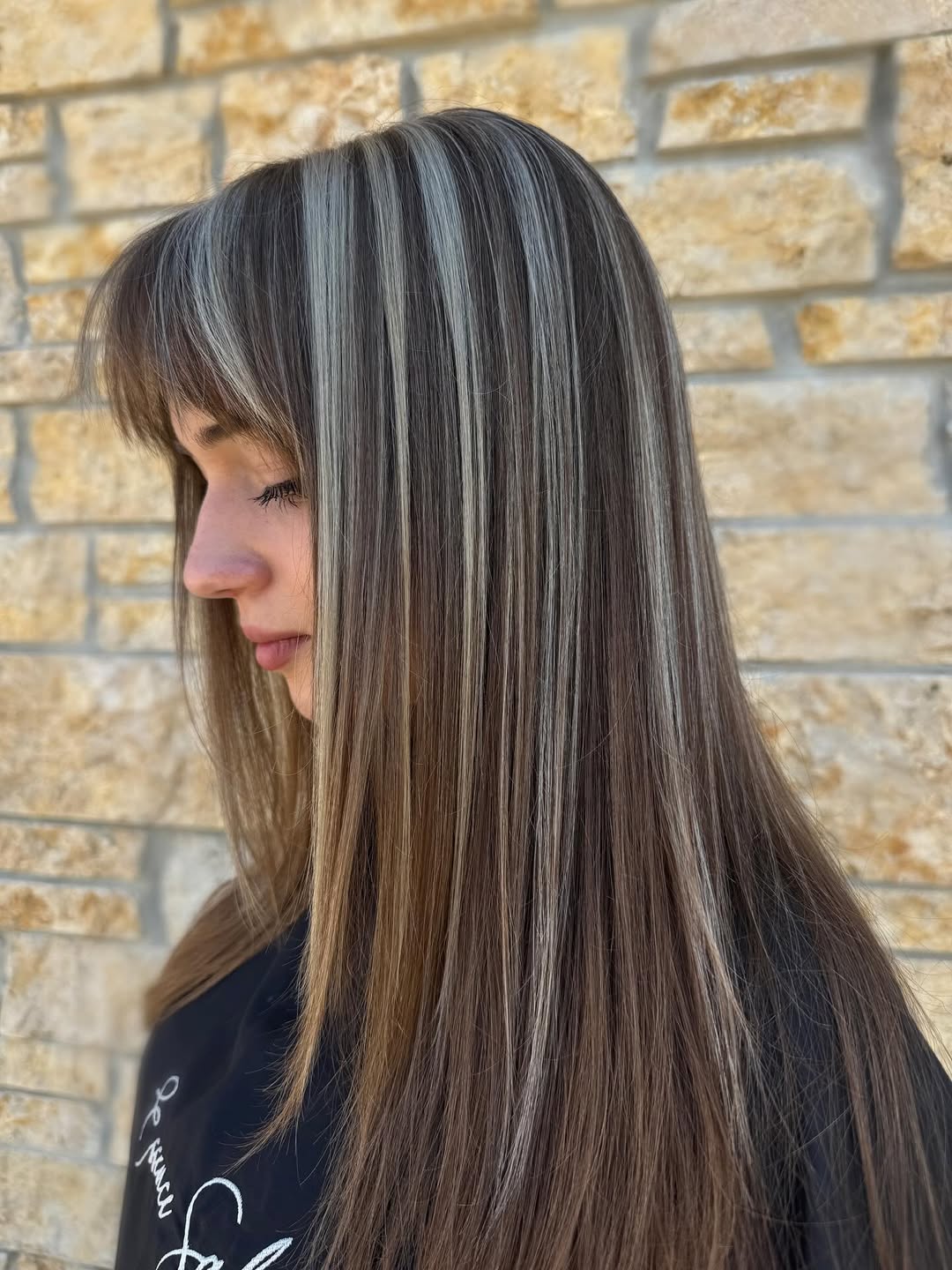 Chunky highlights are the favorite trend of all celebrities who keep up with the latest fashions. The 2025 version is more of face-framing ribbon highlights that continue throughout the strands. However, some bolder options like skunk stripes and zebra-looking patterns are also in trend.