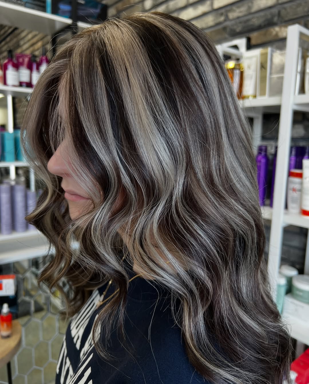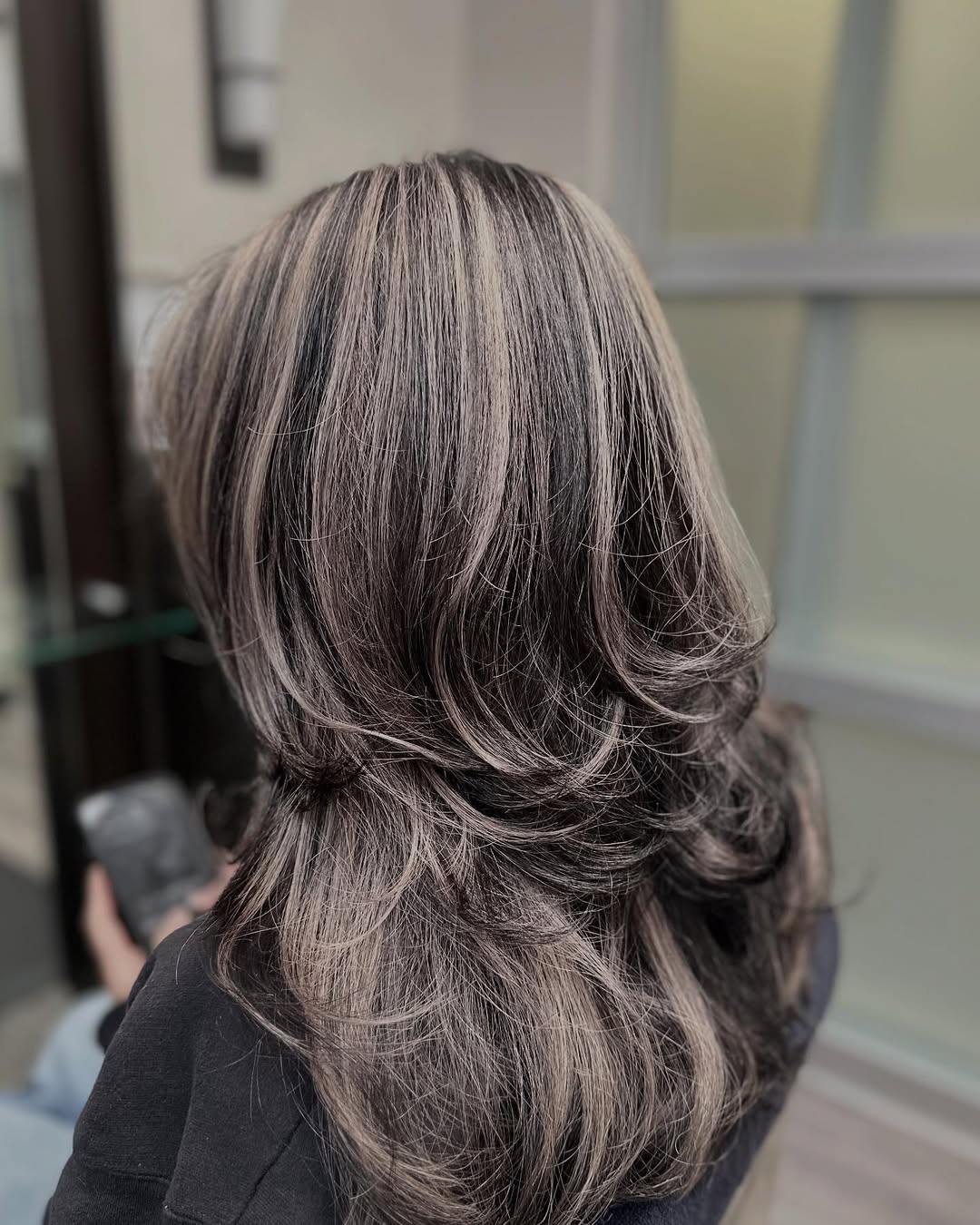 If this look makes you want highlights in your hair, then you know how to refresh your hairstyle! The cascading ashy hues will add lift to your dark roots and visually thicken your thin locks.