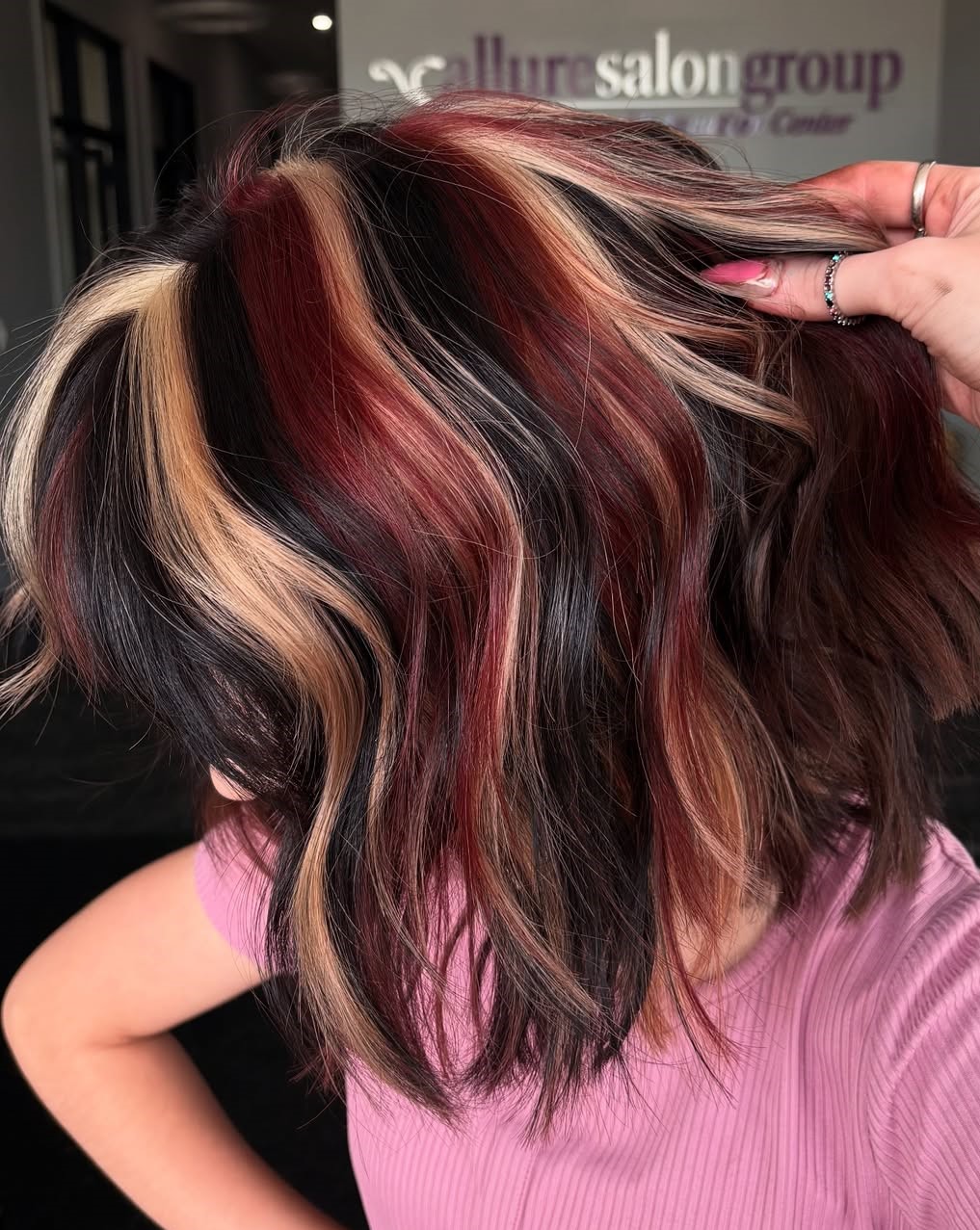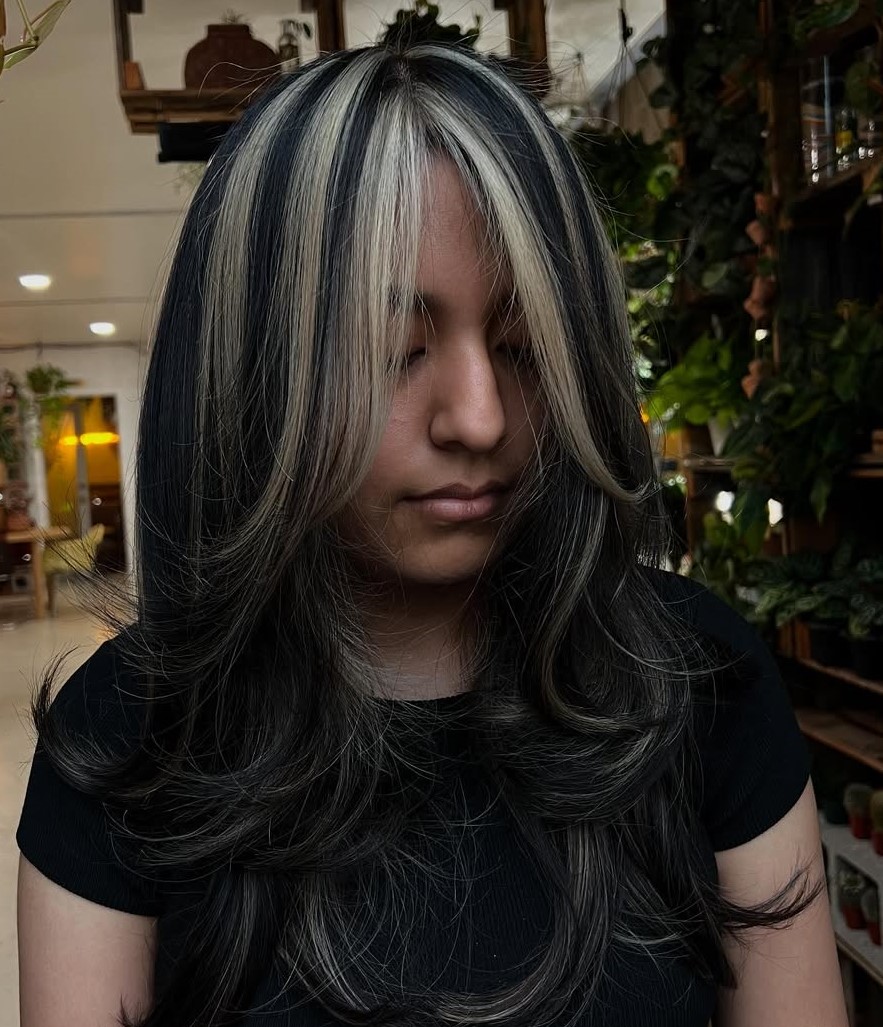 Chunky highlights are the favorite trend of all celebrities who keep up with the latest fashions. The 2025 version is more of face-framing ribbon highlights that continue throughout the strands. However, some bolder options like skunk stripes and zebra-looking patterns are also in trend.