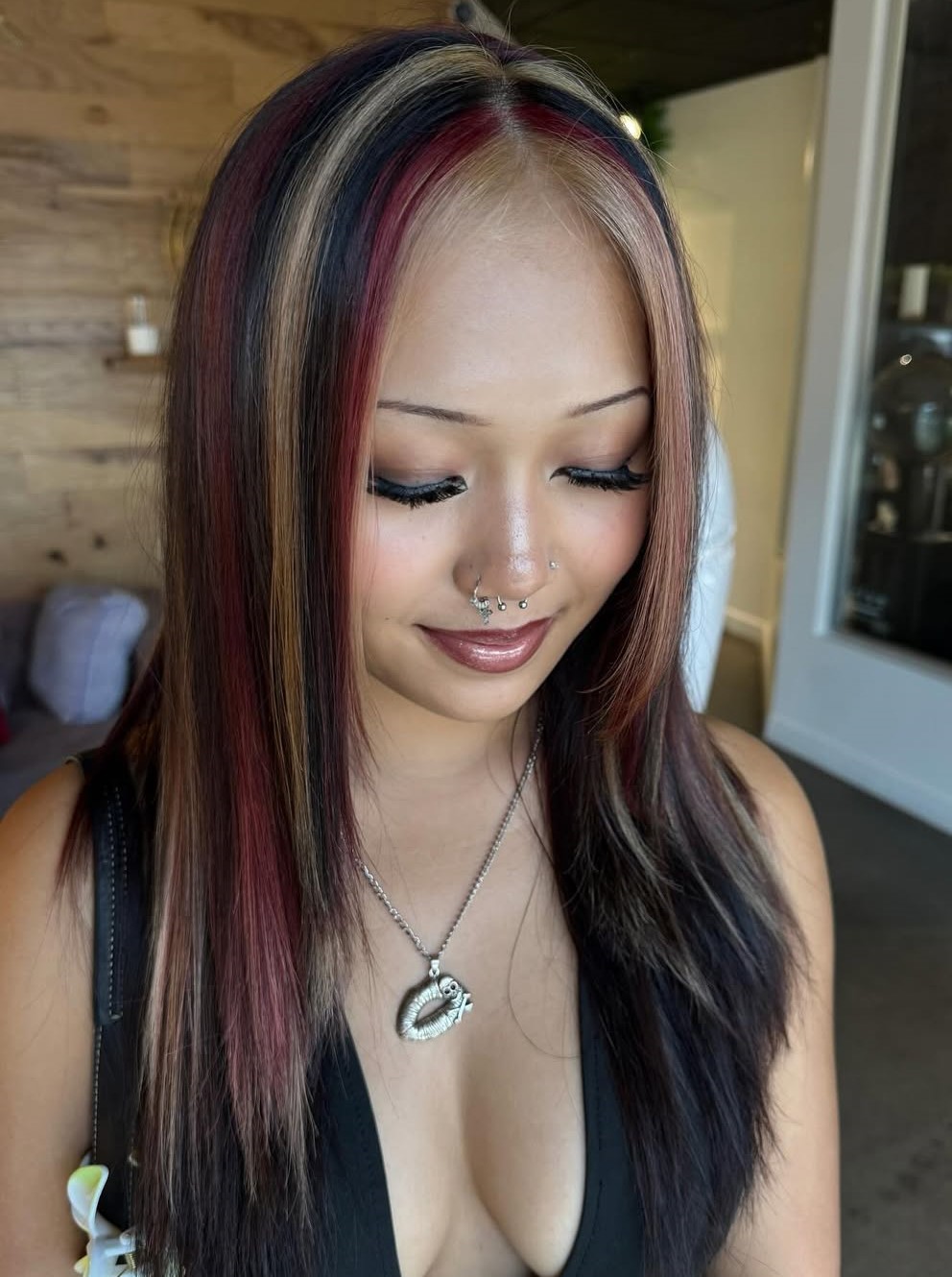 For those who want to take a bolder approach to the trend, this platinum blonde ribbon highlight on black hair is just what you need. Paired with funky ‘do, this hue looks truly stylish and unique.