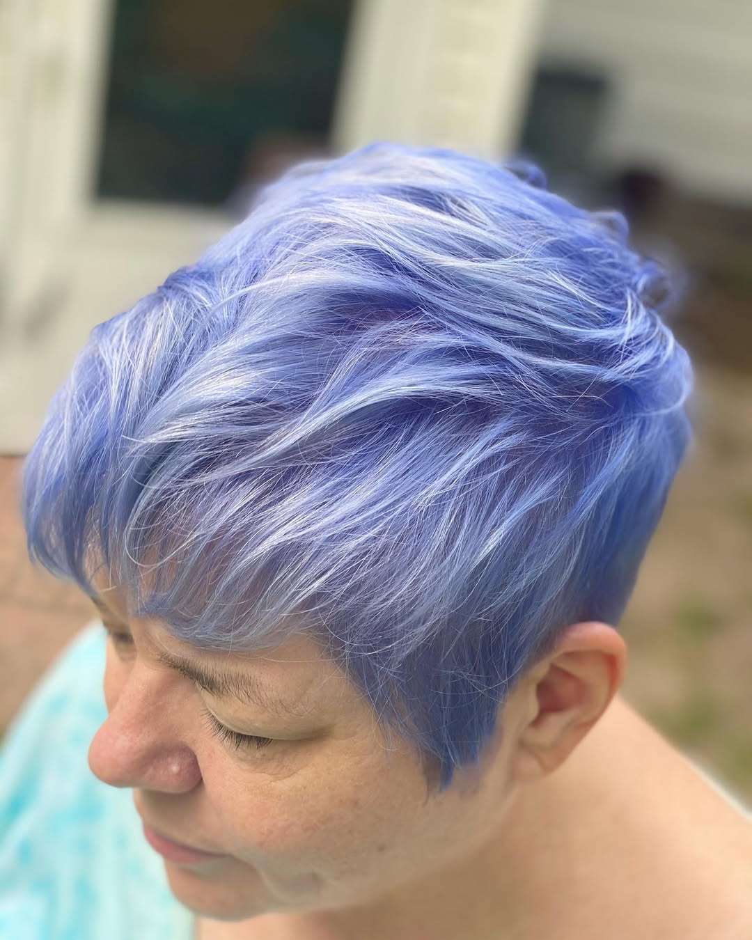 While the younger generation is experimenting with the granny hair craze, the older generation is ramping up the future of colored hair. Silver pixie cuts like this have more than a little bit of edge! The teal roots and light purple highlights make all the difference for the overall look.