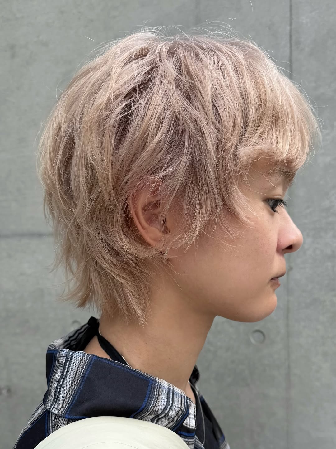 This icy, textured pixie has a bold charm about it. The cool-toned blonde hue adds a high-fashion edge. Slightly tapered around the ears and nape, this haircut is easy to care for day to day.
