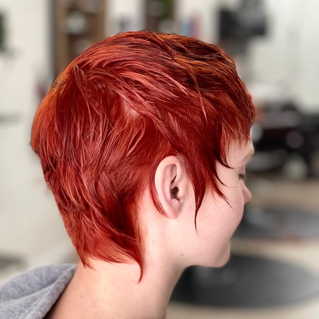 A red pixie cut gains vibrancy and dimension by combining different red hair shades. Some feathered layers will create texture and give a soft finish to the dyed pixie cut.
