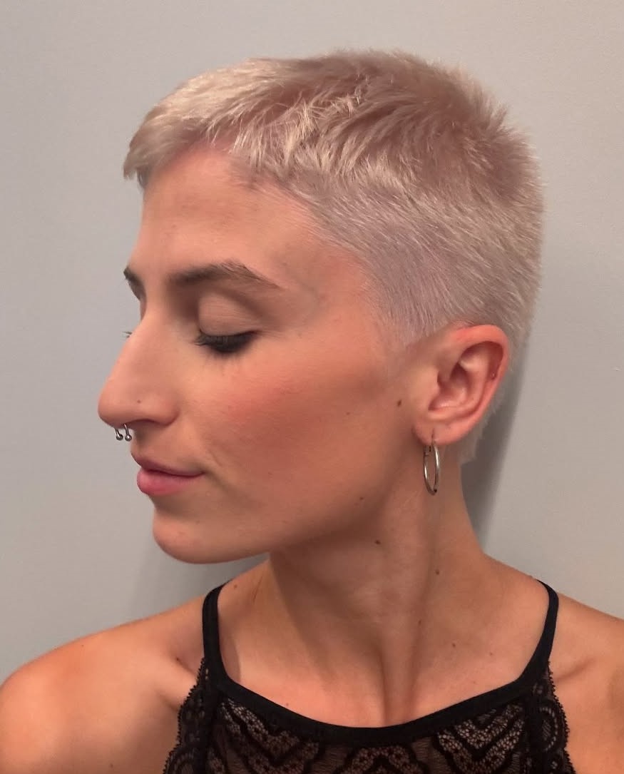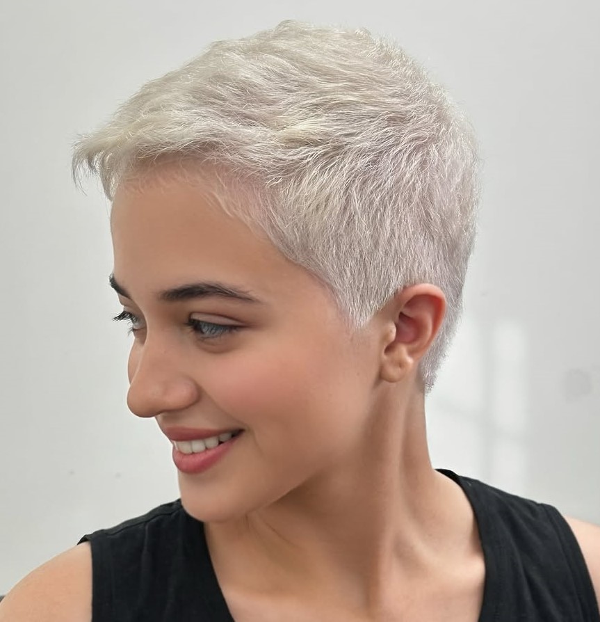 This icy, textured pixie has a bold charm about it. The cool-toned blonde hue adds a high-fashion edge. Slightly tapered around the ears and nape, this haircut is easy to care for day to day.