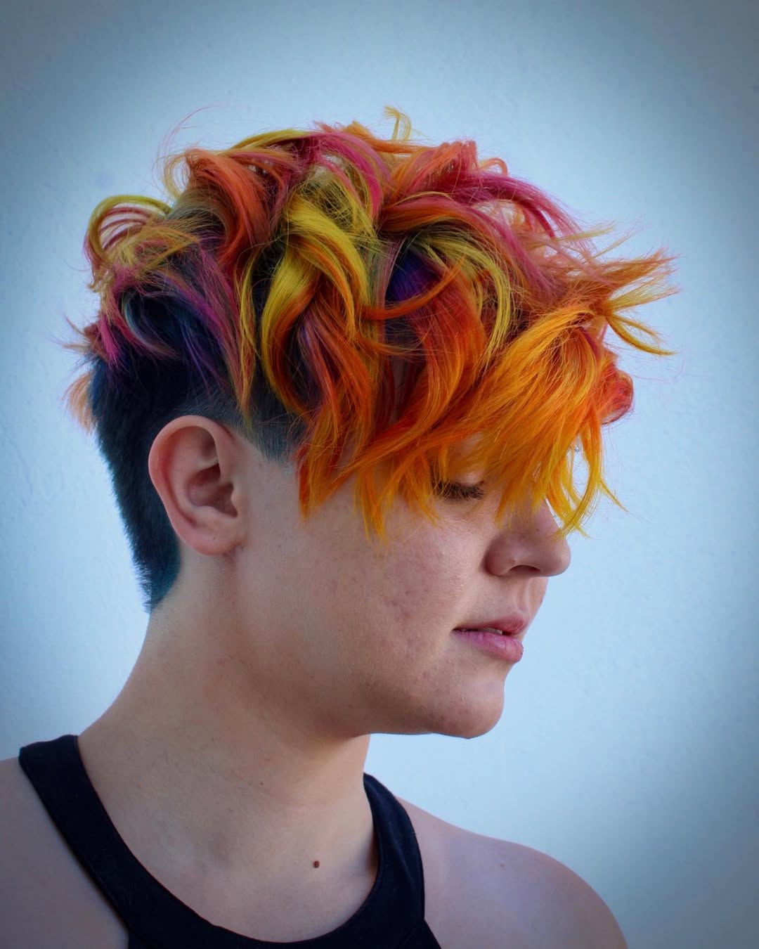 Rainbow hair is a very whimsical hair color idea, but you will always see women eager to join the unicorn tribe. If you feel ready to go this way, a textured pixie cut will make an excellent canvas.