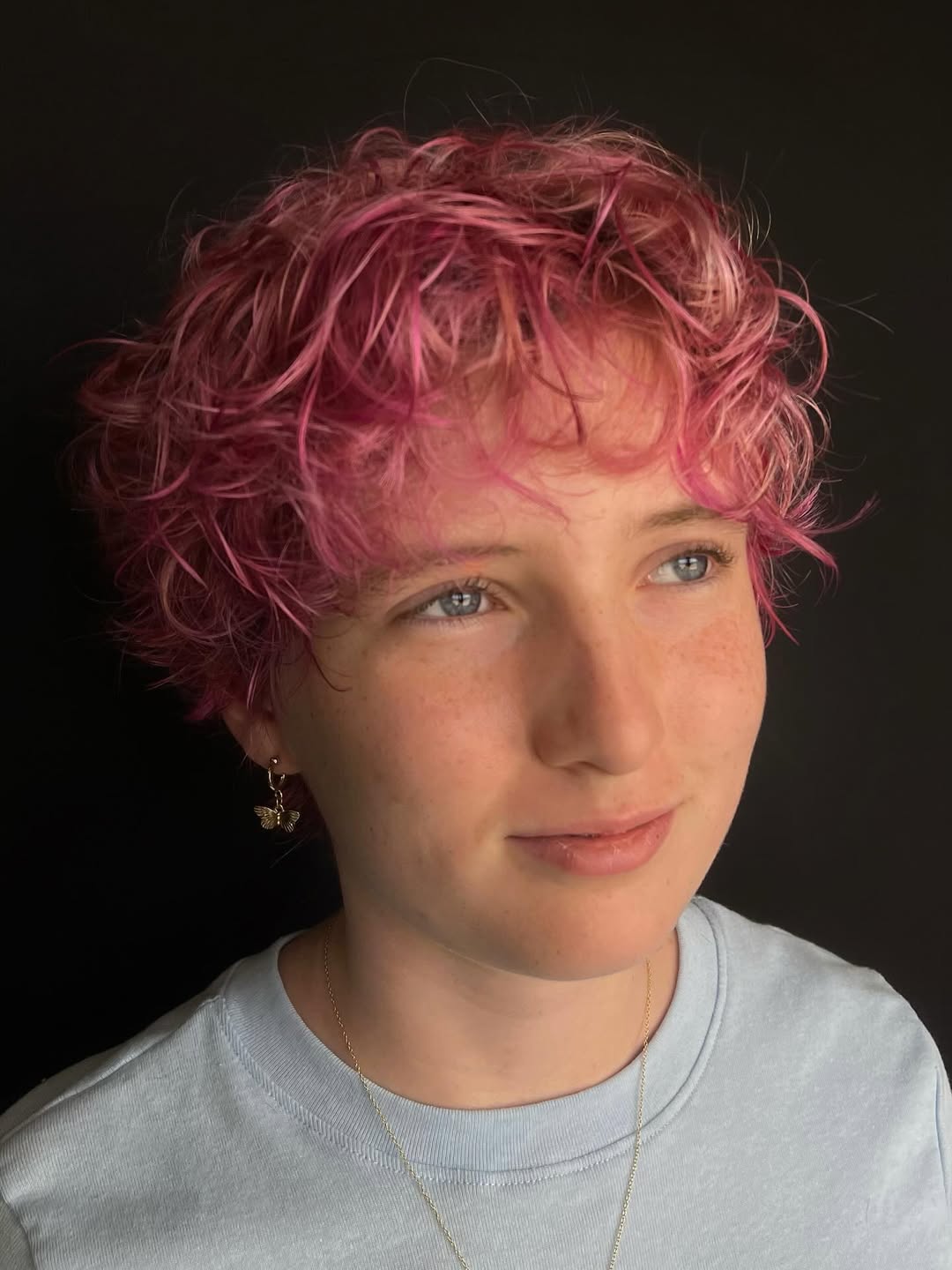 Sleek and elegant, a pink pixie haircut creates an intriguing style. Shadow roots and peachy highlights make a good addition to the main color.