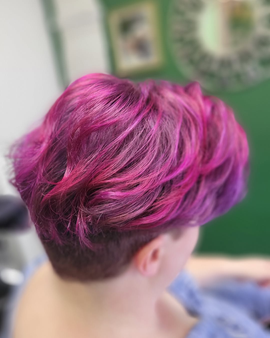 Soft waves are usually romantic, but when combined with a shaved design and violet highlights, they become tough and exciting. It is a great way to show off your individuality, especially if you work in a creative environment.