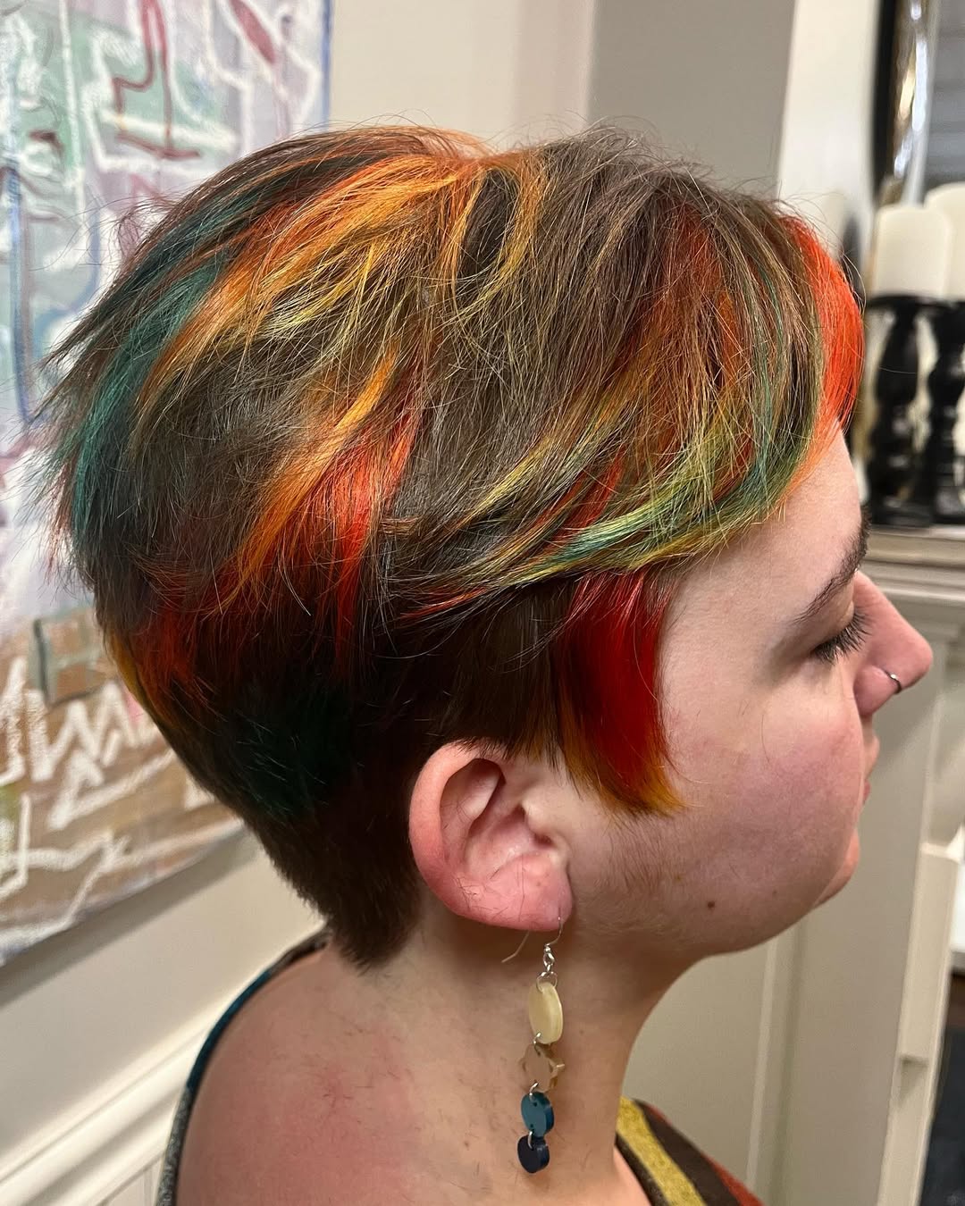 Looking at this piece of hair art, would you ever believe this is a quarantine DIY dye job? It is, though. The hair blogger used lots of pastel colors to create a rainbow pixie hairstyle that is showy, yet not too edgy.