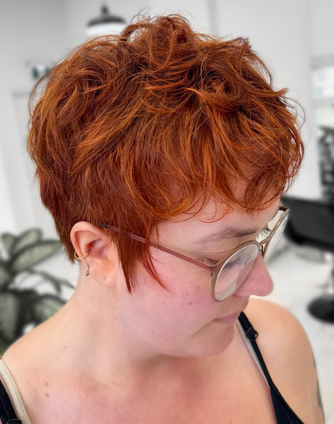 This red pixie cut is no mere red pixie cut. It’s choppy, with subtle highlights and awesome spiky texture. The color is flattering for both fair skin tones and tanned skin.
