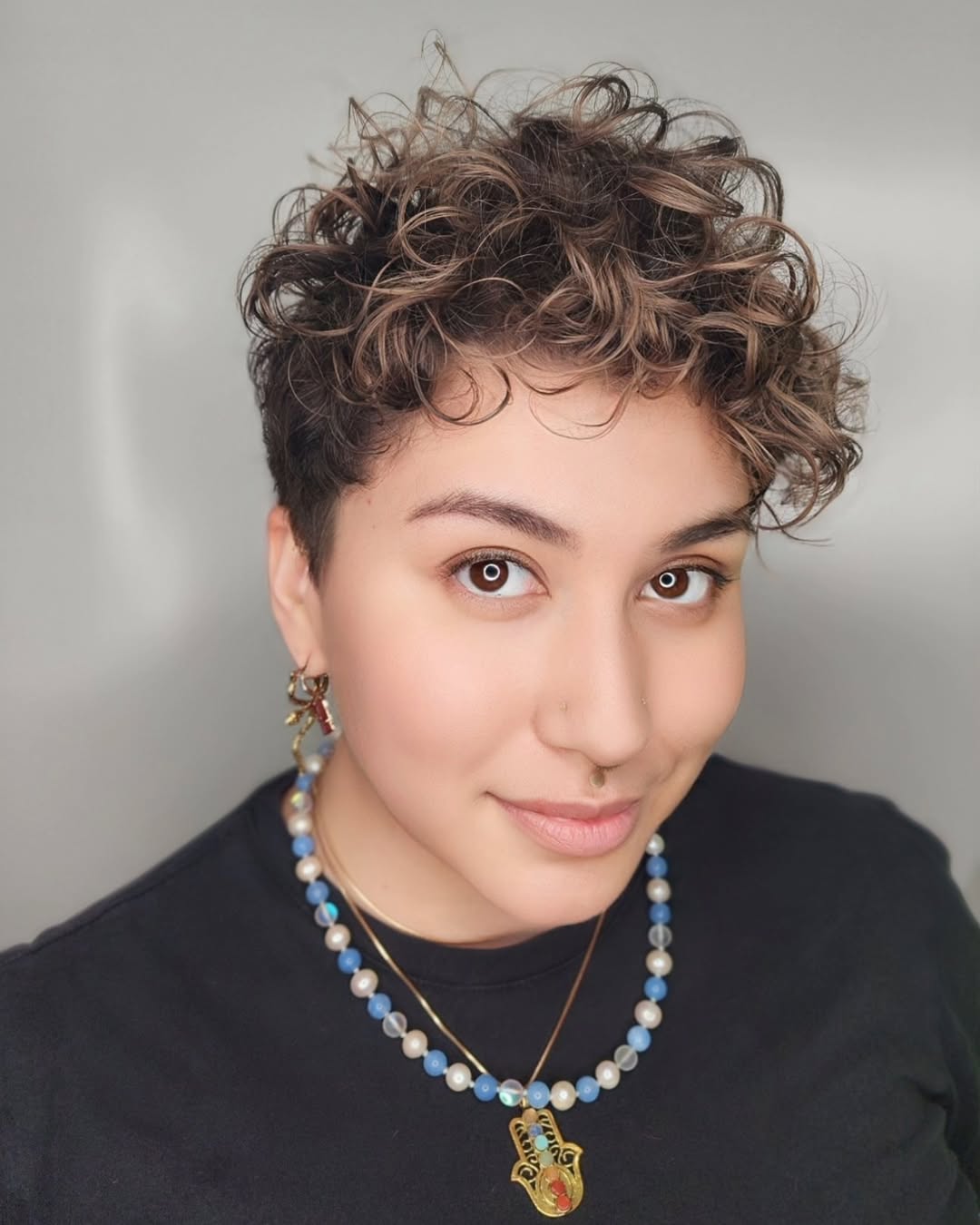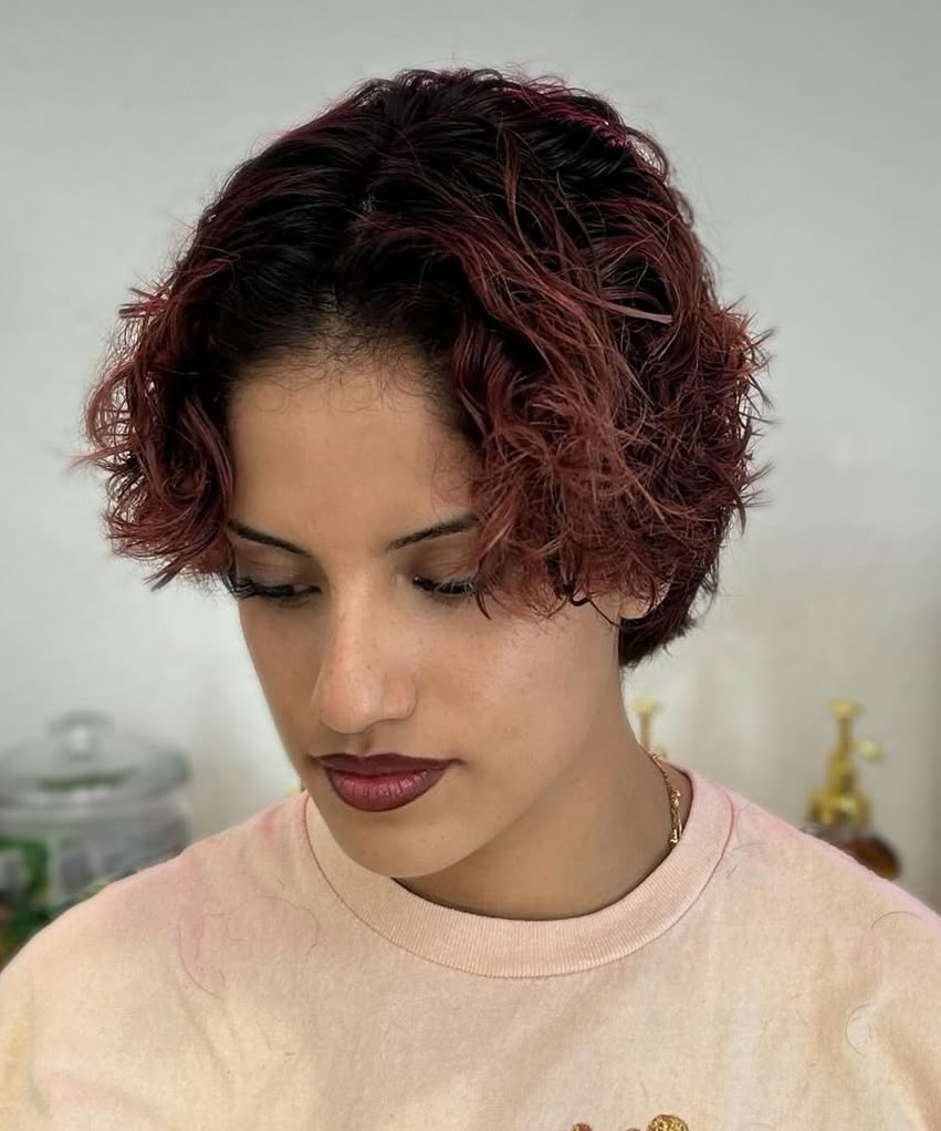 Curly bangs are all the rage, inspiring more and more women to take up the Curly Girl method and embrace their unique hair type. Sweet curls are the perfect pairing with an edgy pixie cut that boasts a closely cropped nape and temples and chunky, colorful highlights.