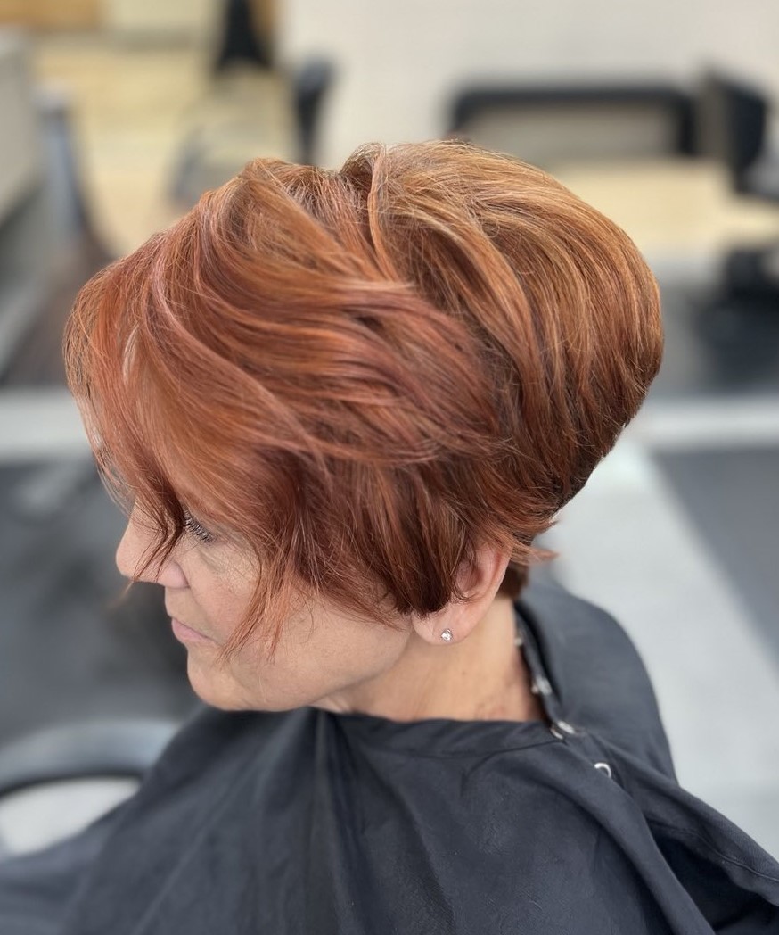 A red pixie cut gains vibrancy and dimension by combining different red hair shades. Some feathered layers will create texture and give a soft finish to the dyed pixie cut.