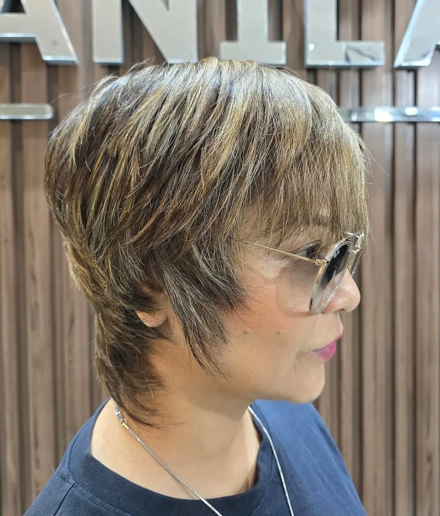 This proves that you can sport a colored pixie cut at any age. It is all about your confidence and personal style. The bright yellow and copper bangs are a huge update to the medium brown base color, and they subtly draw attention to hazel eyes.
