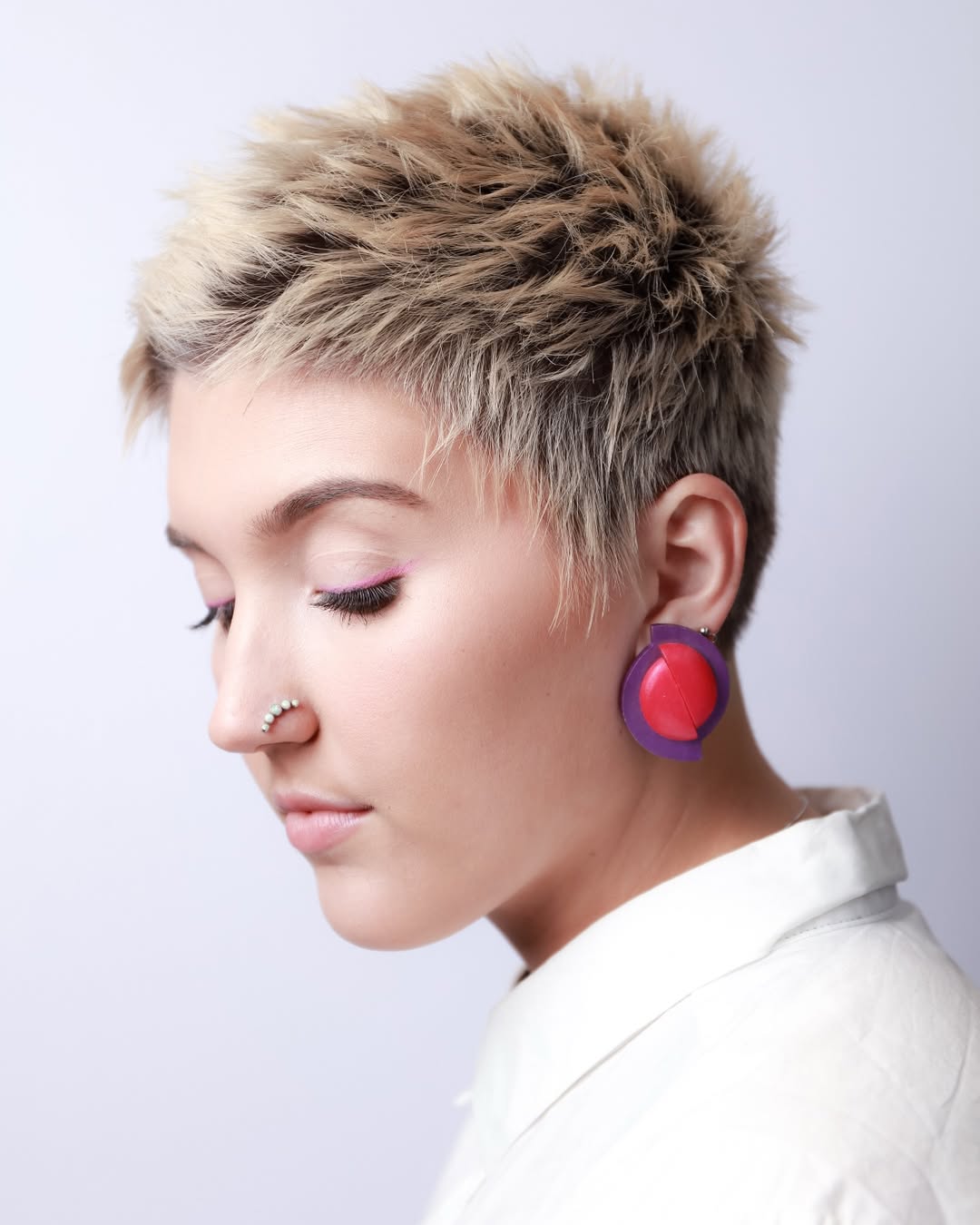 Sleek and elegant, a pink pixie haircut creates an intriguing style. Shadow roots and peachy highlights make a good addition to the main color.