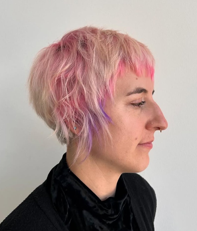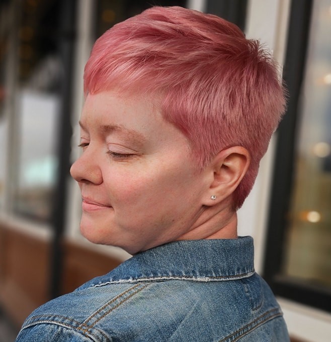 Sleek and elegant, a pink pixie haircut creates an intriguing style. Shadow roots and peachy highlights make a good addition to the main color.