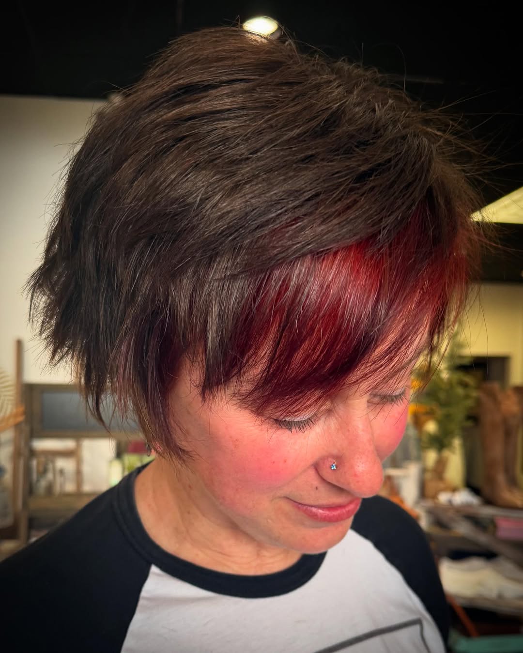 Sometimes, it’s best to stick with the tried and true styles. A textured ash brown pixie with wispy bangs is a classic look that can work for any occasion and in any setting.