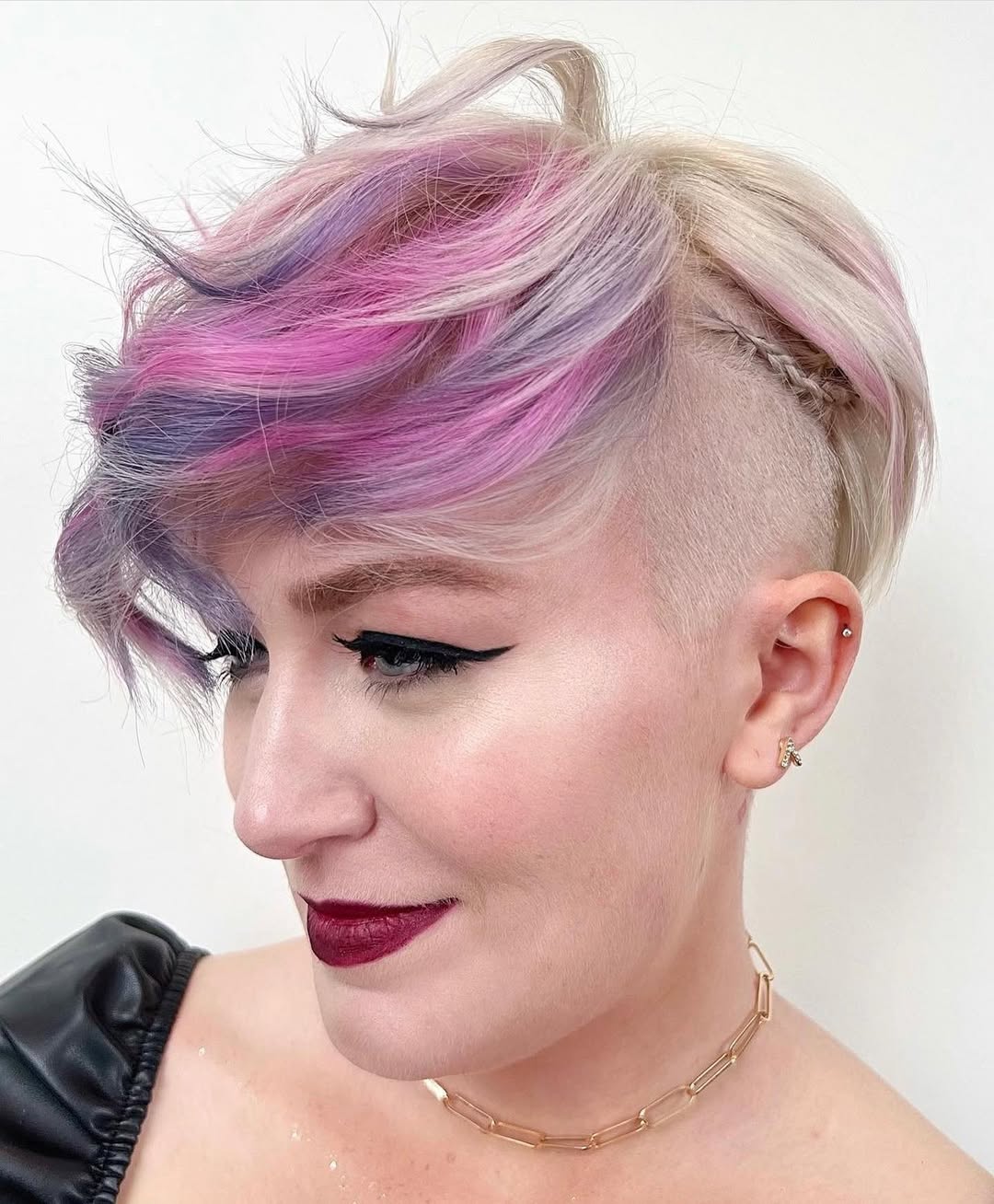 Soft waves are usually romantic, but when combined with a shaved design and violet highlights, they become tough and exciting. It is a great way to show off your individuality, especially if you work in a creative environment.