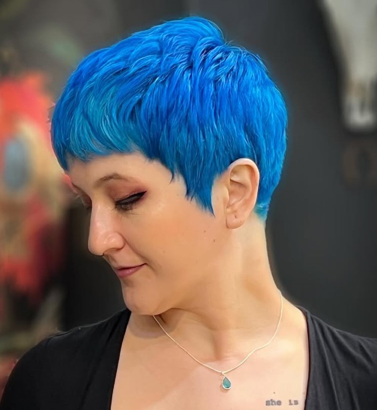 Asymmetrical razored pixie with the undercut design is statement-making on its own, but if you are used to wearing short haircuts, cool hair dye like this turquoise blue can take your hair experiment a step further.