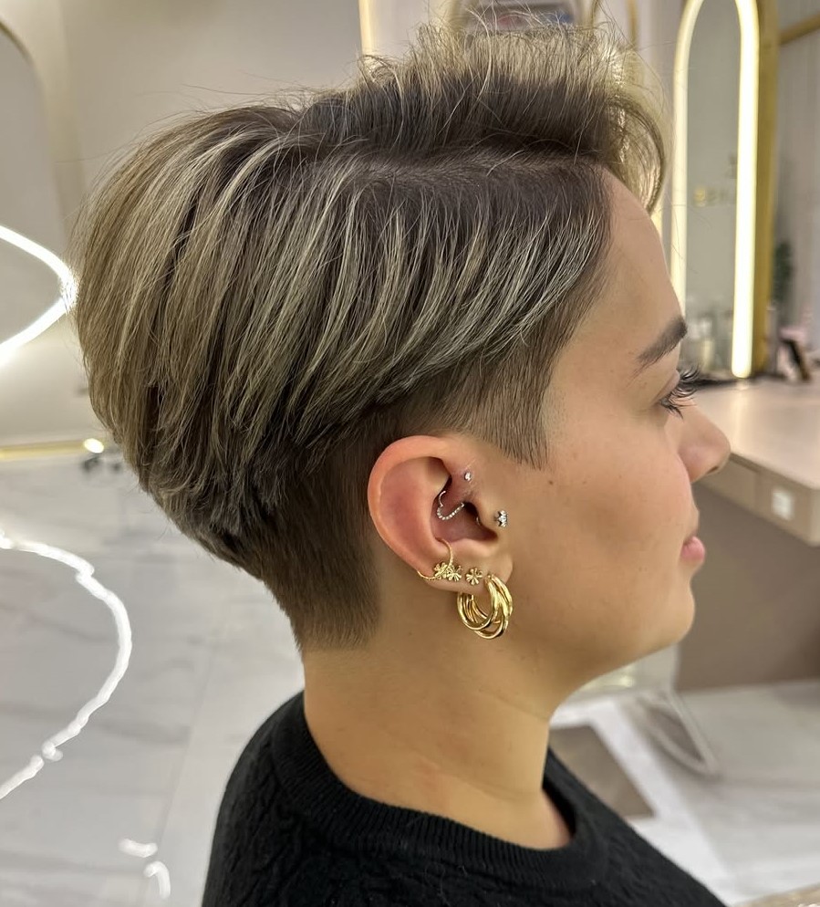 Having ash blonde as a central shade, this pixie bob is pure perfection due to the seamless blend of platinum highlights and cool brown lowlights. Going for a smart color like this, learn to prevent brassiness starting day one.